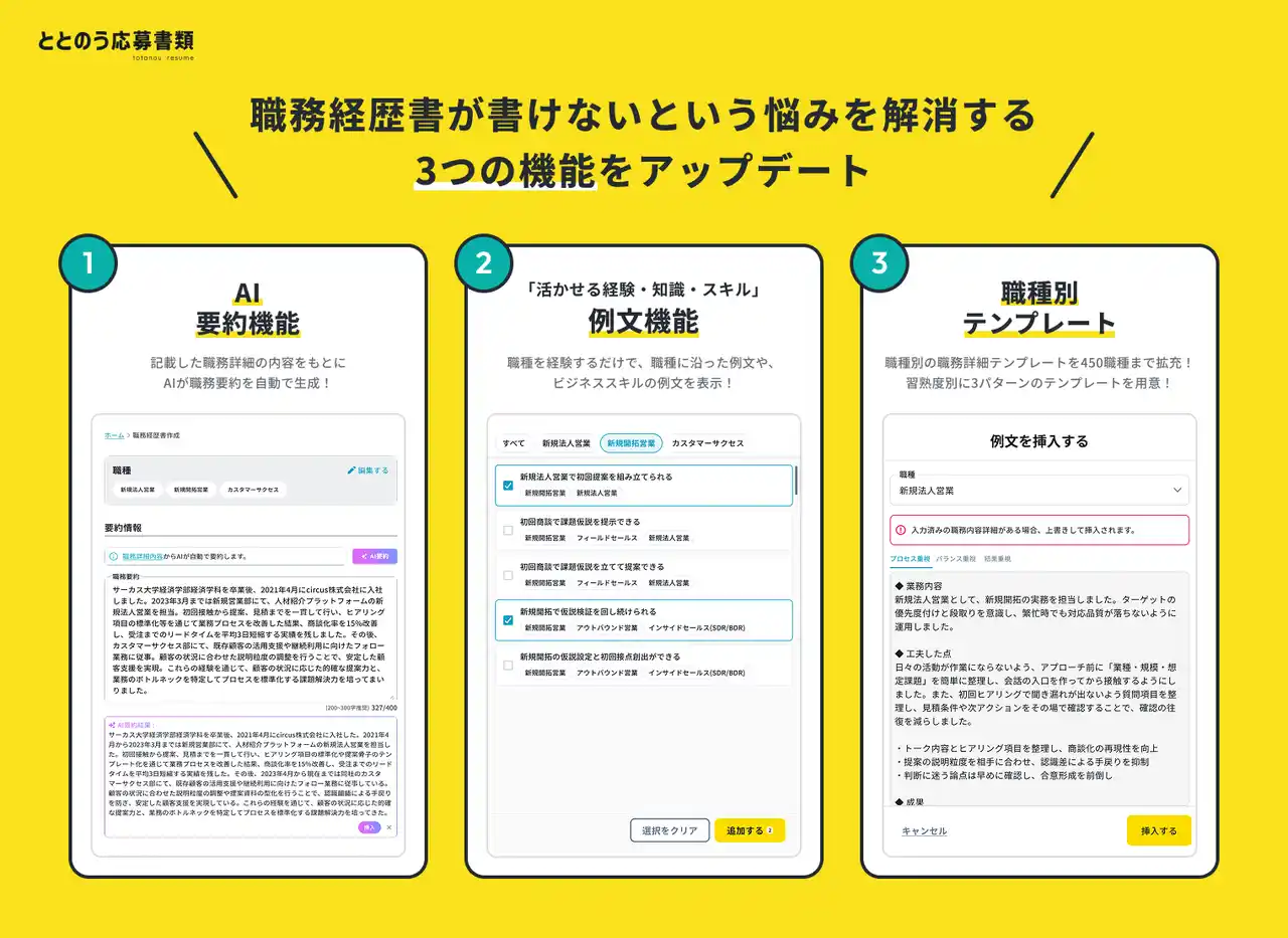 circus株式会社(所在地:東京都中央区、代表取締役:⽮部貴志)が運営する履歴書・職務経歴書作成サービス「ととのう応募書類」は、職務経歴書の作成をサポートする新機能を追加いたしましたのでお知らせいたします。今回のアップデートでは、「活かせる経験・知識・スキル」の例文機能とAIによる職務要約の自動生成機能を新しく追加、職種別テンプレートは470職種に拡充いたしました。 |