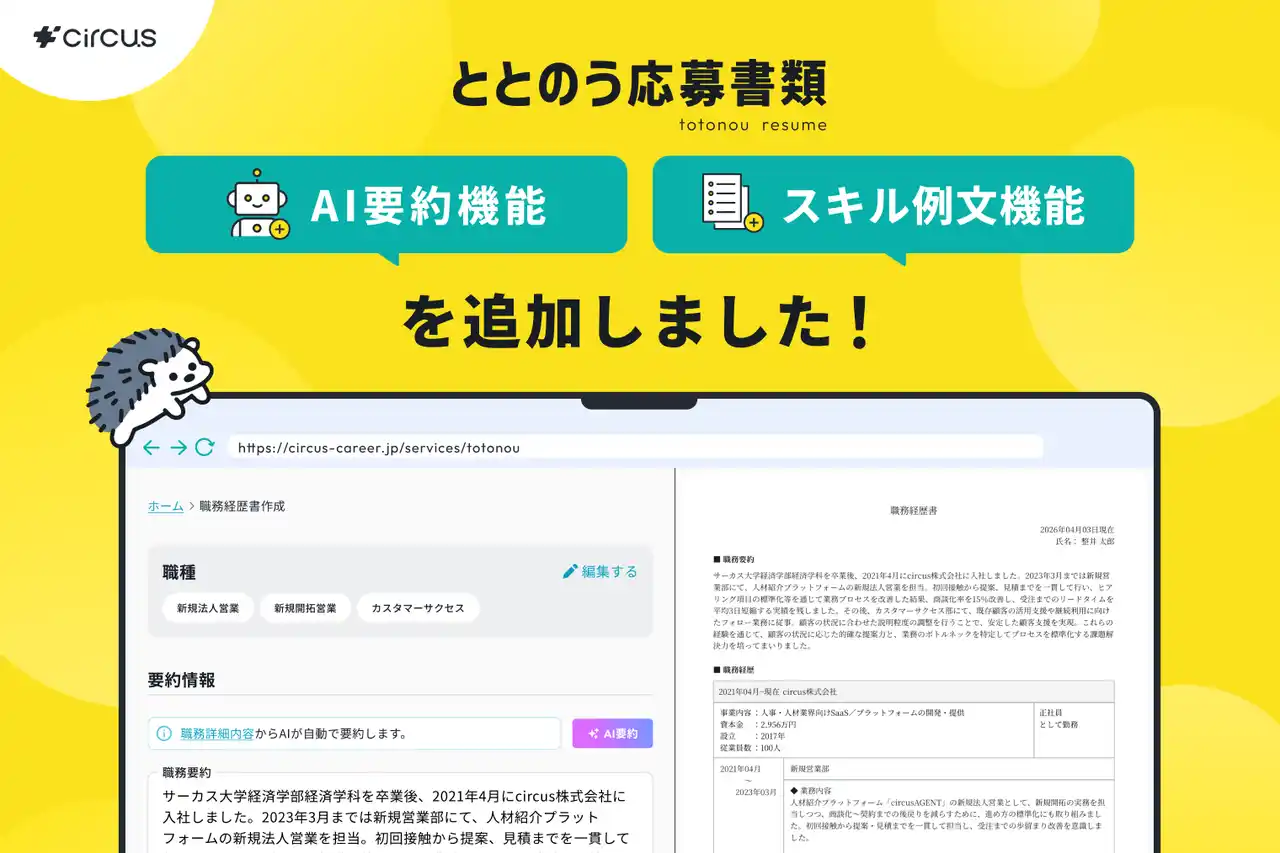 履歴書・職務経歴書作成サービス「ととのう応募書類」:https://circus-career.jp/services/totonou