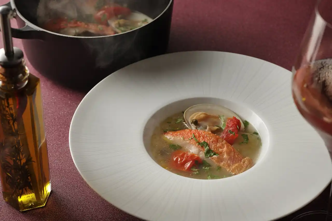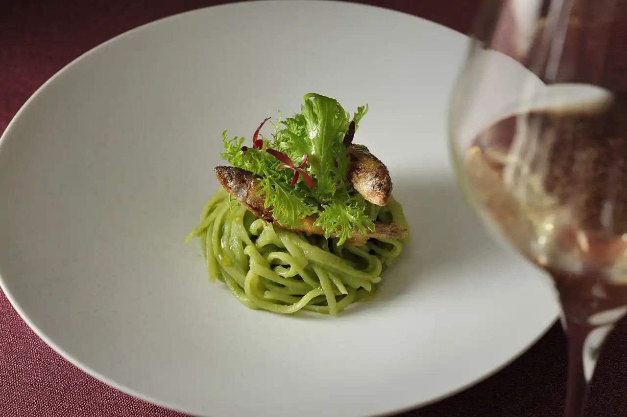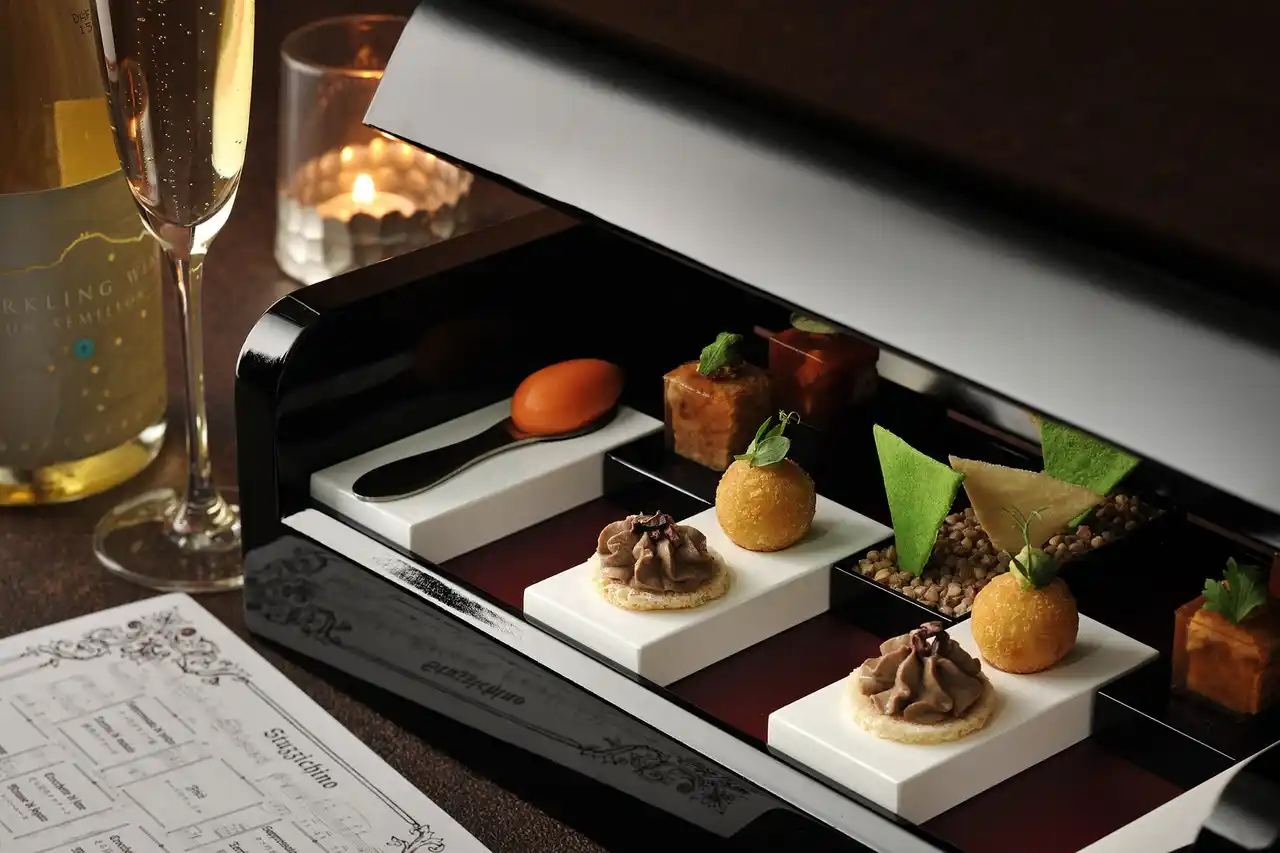 | 夕食は、地元信州のワインとのマリアージュを追求した本格的なイタリアンコースを提供します。信州・松本は、桔梗が原ワインバレーなどを抱える、日本ワインの主要産地です。また信州のワインは、澄んだ味わいと瑞々しい果実味が特徴です。その軽やかな余韻を消さないために、ソースで重層的に仕上げるのではなく、オリーブオイルの瑞々しさで繋ぐイタリアンで美食体験を追求することにしました。最初の一品には「ストゥッツキーニ(小前菜)」が、ピアノをモチーフにした特注の器で登場します。イタリア語で「エレガンテ」は音楽の曲想用語としても使われますが、ピアノをモチーフにした最初のストッツキーニは、まさにその言葉を象徴する一皿と言えます。 | |||||||||