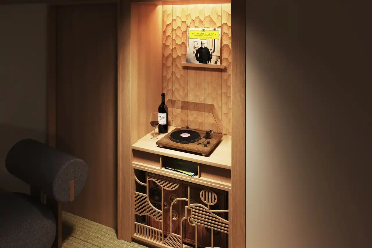 | 松本市は、かねてから「学(学問)・岳(山岳)・楽(音楽)」の「三ガク都」と呼ばれ、独自の文化を育んできました。界 松本では、このうちの「楽(音楽)」をテーマに、すべての客室をご当地部屋「GAKUの間」へと刷新します。 全客室にスピーカーとアナログレコードプレーヤーが配され、滞在中は、松本市にゆかりある音盤をはじめ、多様なジャンルの音楽からその時の気分に合わせた一枚を選び、日常を忘れるリラックスした時間を過ごすことができます。また、寝台のヘッドボードを彩るのは、名門ギターメーカーが集まる松本の塗装技術として培われた「松本渓声(けいせい)塗り」のアートパネルです。深みのある艶やかな木目が、この土地に息づく工芸の美しさと、音楽の街としての息遣いを静かに伝えています。 | |||||||||