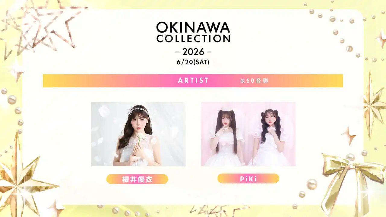 アーティストライブには、FRUITS ZIPPERのメンバーとして活動し、昨年9月にソロデビューを果たした櫻井優衣の出演が決定。さらに、昨年の「オキコレ2025」のステージでデビューを飾った、FRUITS ZIPPERのピンク担当・松本かれんとCUTIE STREETのピンク担当・桜庭遥花によるユニットPiKiが1年ぶりにオキコレのステージへ帰ってきます。ソロとして、そしてユニットとして披露される、2組のスペシャルなパフォーマンスにご期待ください。 |