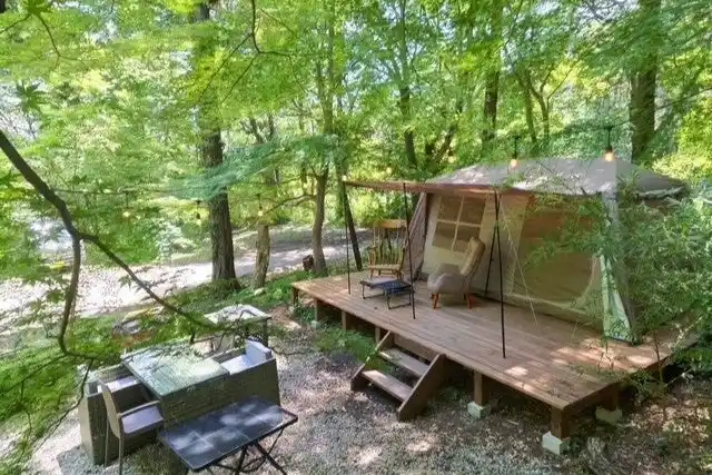 東大和市の狭山丘陵の中にある、手ぶらで日帰りアウトドアの体験が楽しめる施設です。大型テントサイト・60 年以上続く老舗料亭が提供する厳選食材BBQ・焚火を新緑の森の中でお楽しみいただけます。 |