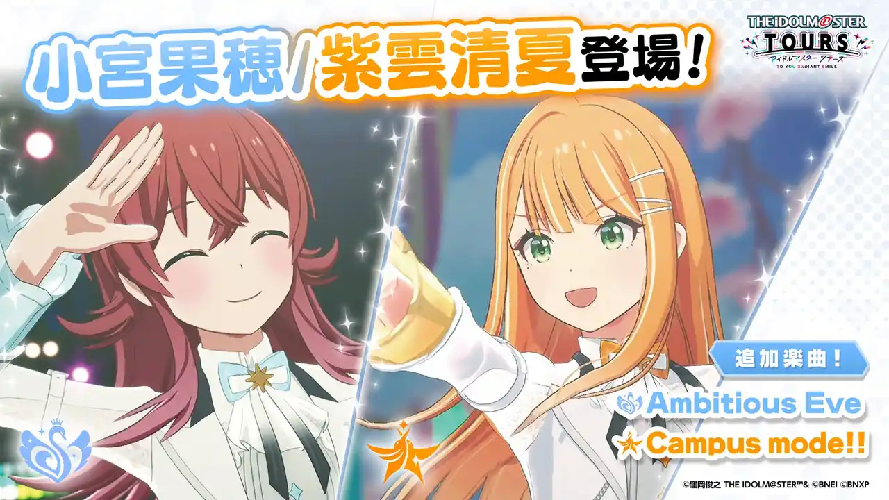 「アイドルマスター シャイニーカラーズ」より小宮果穂、「学園アイドルマスター」より紫雲清夏が『アイドルマスター TOURS』に登場し、『Ambitious Eve』・『Campus mode!!』の2曲を追加楽曲として収録します。 |