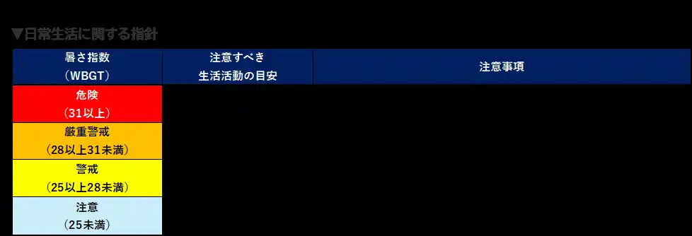 とされており、近年の夏は日中の多くの時間帯でWBGT31℃以上の危険レベルに到達しています。 |