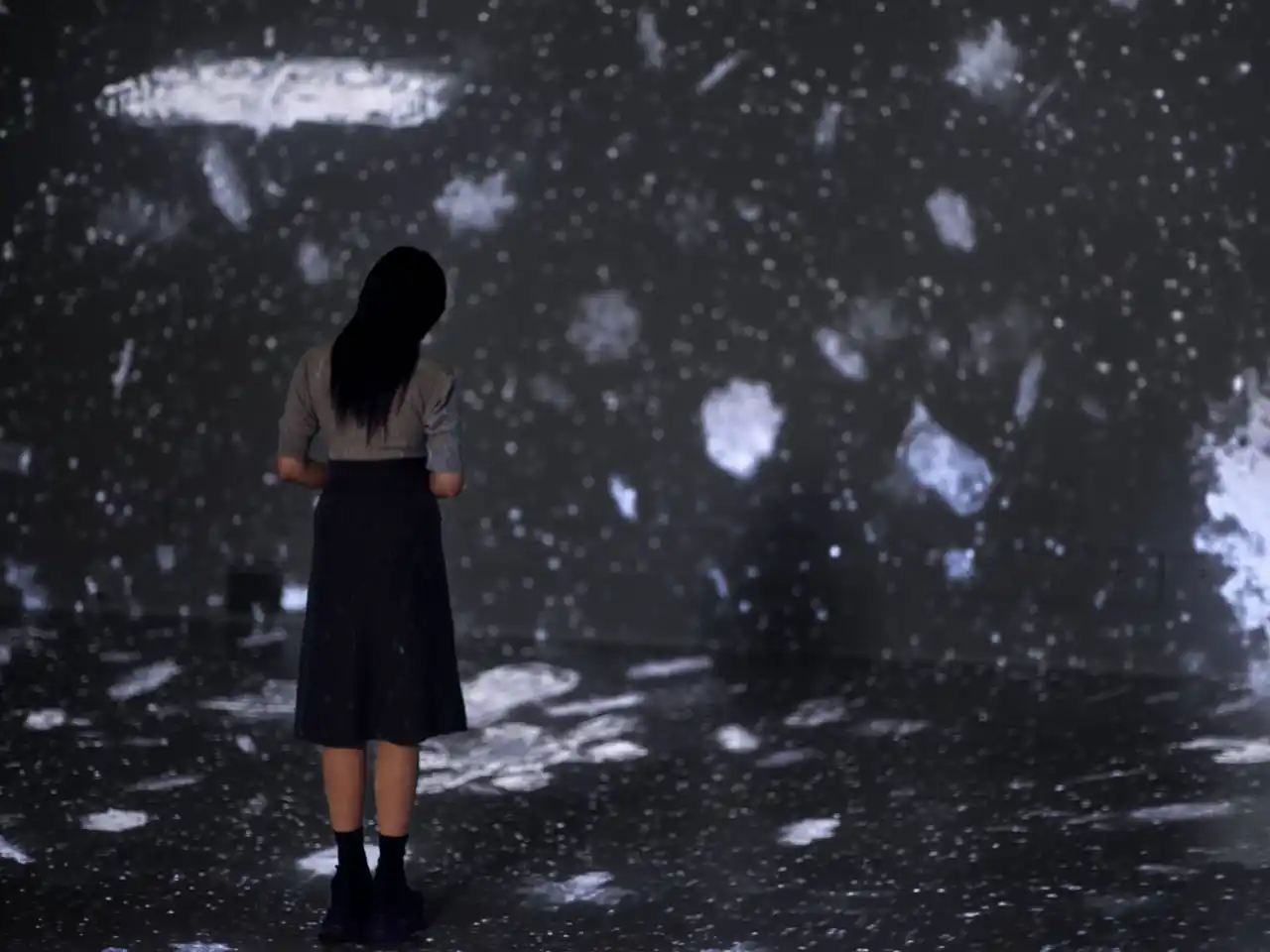 夜明けの海霧、雲間から射す光芒、果てしなく広がる雲海、雷が轟く積乱雲、薄明薄暮の色彩、蒼穹──思わず目を奪われる刻々と移ろう空の多彩な表情を、ダイナミックな没入体験へと昇華させた作品です。雲海、積乱雲、天使のはしごなど、さまざまな気象現象を雲研究者の荒木健太郎さん監修のもと精緻に描写。鑑賞者は、空中を散歩するかのように雲海の上を進み、積乱雲の内部へ分け入っていきます。さらにはミクロの世界で氷晶が雪結晶へと成長し、あられ、そして雨粒へ変化していく現象と対面します。 |