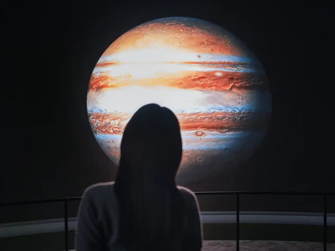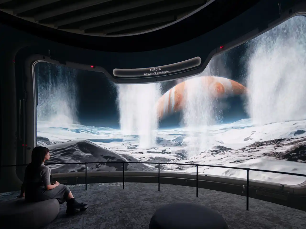 人類が歩んできた惑星探査による発見と、宇宙に広がる未踏の領域--。その両方を科学観測データと科学的知見に基づき、高精細なCGで没入型映像体験として提示。既踏から未踏の領域につなぐ「宇宙の旅」へ鑑賞者を誘います。鑑賞者は宇宙船のラウンジを模したシアター空間で、窓の外に広がる天体の景色や現象、そして未踏の世界と対峙します。旅のガイドを務めるのは、音楽家・青葉市子さん。壮大なスケールで眼前に広がる宇宙と対比し、一人ひとりの心へそっと寄り添うような声が、太陽、火星、木星および衛星エウロパ、そして太陽系外へと続く宇宙の旅を詩的に彩ります。 |