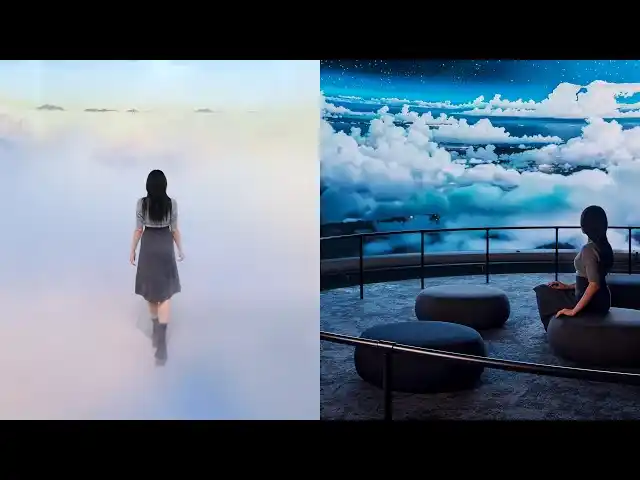 本作では、天井高約8mの空間を囲む4K映像が前後左右から足元にまで広がり、視界一面が空に包まれるような没入感を創出します。さらに、12.2チャンネルの立体音響システムや霧・風の演出効果を取り入れることで*、雲に包み込まれるような感覚を立ち上げます。朝霧の水面から夕焼けの空へ、マクロな雲の世界からミクロな氷晶の世界へ。雲の循環を多元的に交錯させながら、自然の美しさ、繊細さ、そして力強さを体感する作品として提示します。 |
