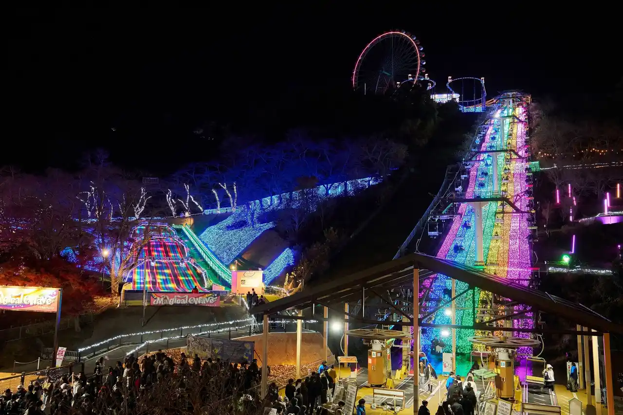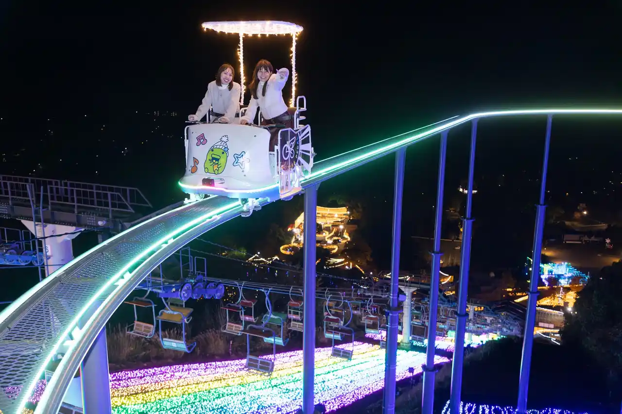 | 2025年夏にオープンした全長100mのスライダー「マジカルウェーブ」と、標高370mの空中を自転車で漕ぎ出す「青空ペダル」が、夜限定の特別演出として楽しめます。マジカルウェーブでは、鮮やかに光る100mのコースを一気に滑り降りるスリルと爽快感を、青空ペダルは、「さがみ湖で発見!たまごっちのキラキラいるみね~しょん!」エリア登場にあわせて、「たまごっち」仕様の「たまごっちのほしぞらぺだる」として、眼下に広がるイルミネーションを見下ろしながら天空サイクリングを満喫できます。 さらに毎年人気の、虹色の光に包まれながら空中散歩を楽しめる「虹のリフト」とあわせて、「三大体験型イルミネーション」として楽しむことができます。そのほか、「たまごっちのキラキラかんらんしゃ」や、カラフルにライトアップする「光の空中アスレチック」など、起伏に富んだアウトドアリゾートならではの、全11種のナイトアトラクションが楽しめます。 | ||||||||||||||||||