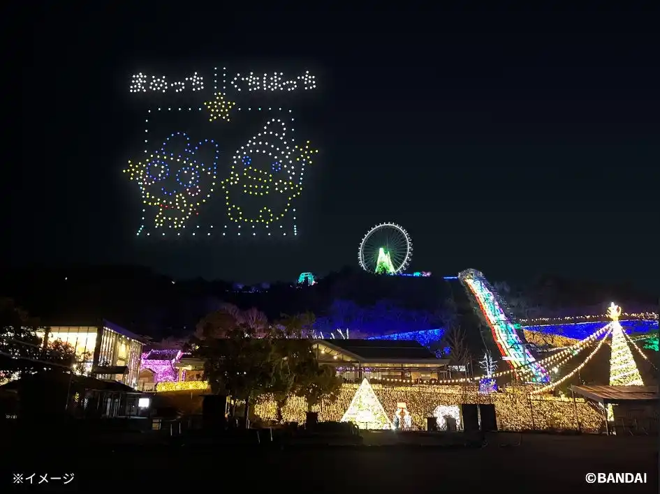 | 標高370mの山頂エリアから、500機のドローンが一斉に飛び立ち、夜空をキャンバスに、たまごっちたちがUFOや流れ星に乗って夜空を駆け巡るシーンなど、キラキラ鮮やかに彩る幻想的なショーを繰り広げます。たまごっちたちの可愛くヘンテコな世界に加え、観覧車や虹色に輝くリフト、そして森の斜面を埋め尽くす約600万球のイルミネーションとともに、これらすべてが一体となって楽しめる圧巻の景色は、さがみ湖イルミリオンならではの感動のハイライトです。 | ||||||||||||||||||