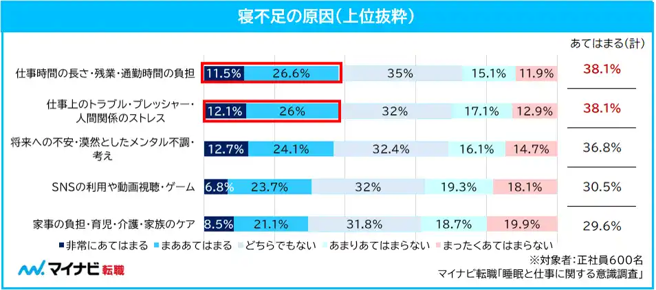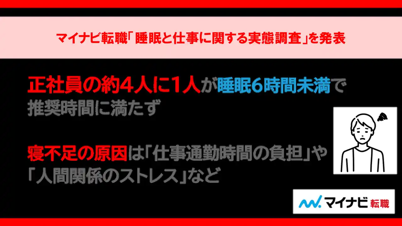 正社員の約4人に1人が睡眠6時間未満で推奨時間に満たず。寝不足の原因は「仕事通勤時間の負担」や「人間関係のストレス」など。約6割が睡眠は「仕事で成果を出す」「円滑な人間関係」において大切と認識