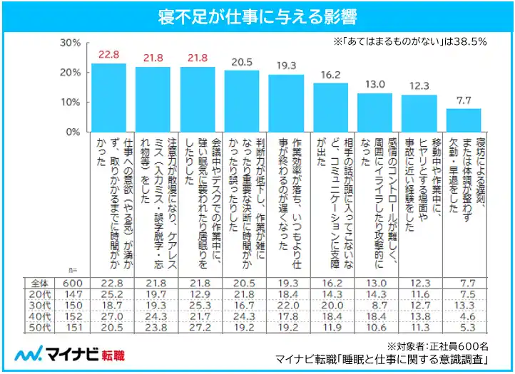 株式会社マイナビ(本社:東京都千代田区、代表取締役 社長執行役員:粟井俊介)が運営する総合転職情報サイト『マイナビ転職』(https://tenshoku.mynavi.jp/)は、20~50代の正社員600名に聞いた、「睡眠と仕事に関する実態調査」の結果を発表しました。今回が初めての調査です。 |