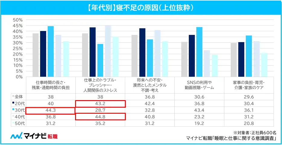 ◆寝不足の原因は「仕事時間・通勤時間の負担」や「仕事・人間関係のストレス」。20代は「将来への不安・漠然としたメンタル不調・考え」が他年代より高い傾向 |