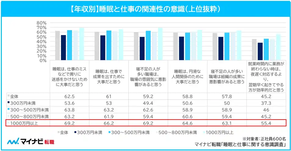 ◆約6割が睡眠は「ミス防止」「仕事で成果を出す」「円滑な人間関係」のために大切と認識。年収が高い人ほど、睡眠と仕事の関連性に対する意識が高い傾向 |