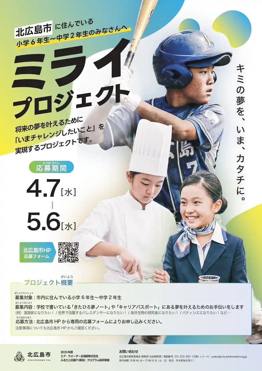 北海道北広島市は、令和8年(2026年)4月に子ども夢応援事業「ミライ・プロジェクト」をスタートしました。市内の子どもたちの生きる力を育むため、夢の実現に向けた「チャレンジ」を行政が全力でサポートします。 |