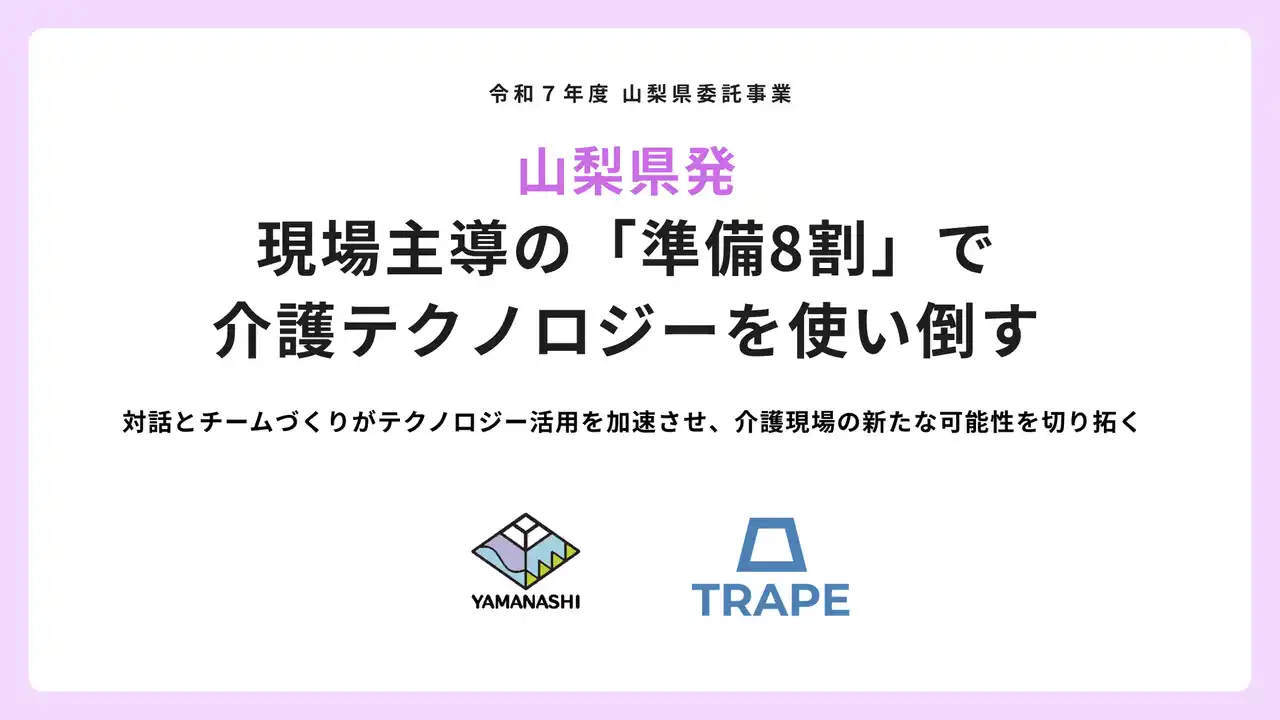 | この度、TRAPEは「令和7年度 山梨県 介護生産性向上総合相談窓口事業」を受託。セミナー開催や技術助言に加え、モデル事業所への伴走支援を実施しました。 | ||||||||||||||||||||||||||||||||||||||