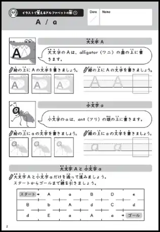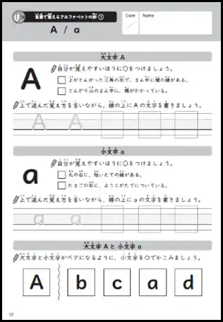 | アセスメントの結果や、ワークシートを活用する中で、学習者の大文字・小文字の識別に不安があったり、書き間違えがよく見られたりする場合には、アルファベットの学習に最適なワークシートを準備。「アルファベット学習ワークシート」では、視覚優位の学習者に向けた「イラストで覚えるアルファベットの形」と、聴覚優位の学習者に向けた「言葉で覚えるアルファベットの形」を用意。英語学習の基礎となるアルファベットを、個々の認知特性に合わせた学習が可能です。 | ||||||||||||||