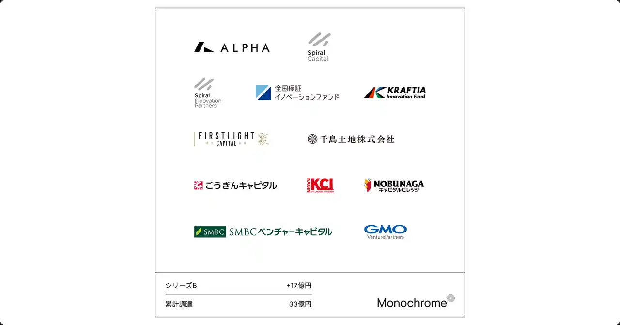 本ラウンドには、Spiral Capital、ALPHAをリードインベスターとして、ファーストライト・キャピタル、GMO Venture Partners、Spiral Innovation Partners(KRAFTIA Innovation Fund、全国保証イノベーションファンドを運営)、千島土地、ごうぎんキャピタル、鹿児島銀行(かぎん共創投資1号投資事業有限責任組合を運営)、NOBUNAGAキャピタルビレッジ、SMBCベンチャーキャピタルが参加しました。 |