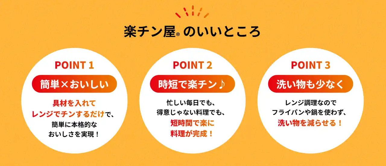 『楽チン屋(R)』シリーズは、具材を入れてレンジで加熱するだけで本格的な一品が完成する、「簡単×おいしい」を追求した電子レンジ専用調味料です。 |