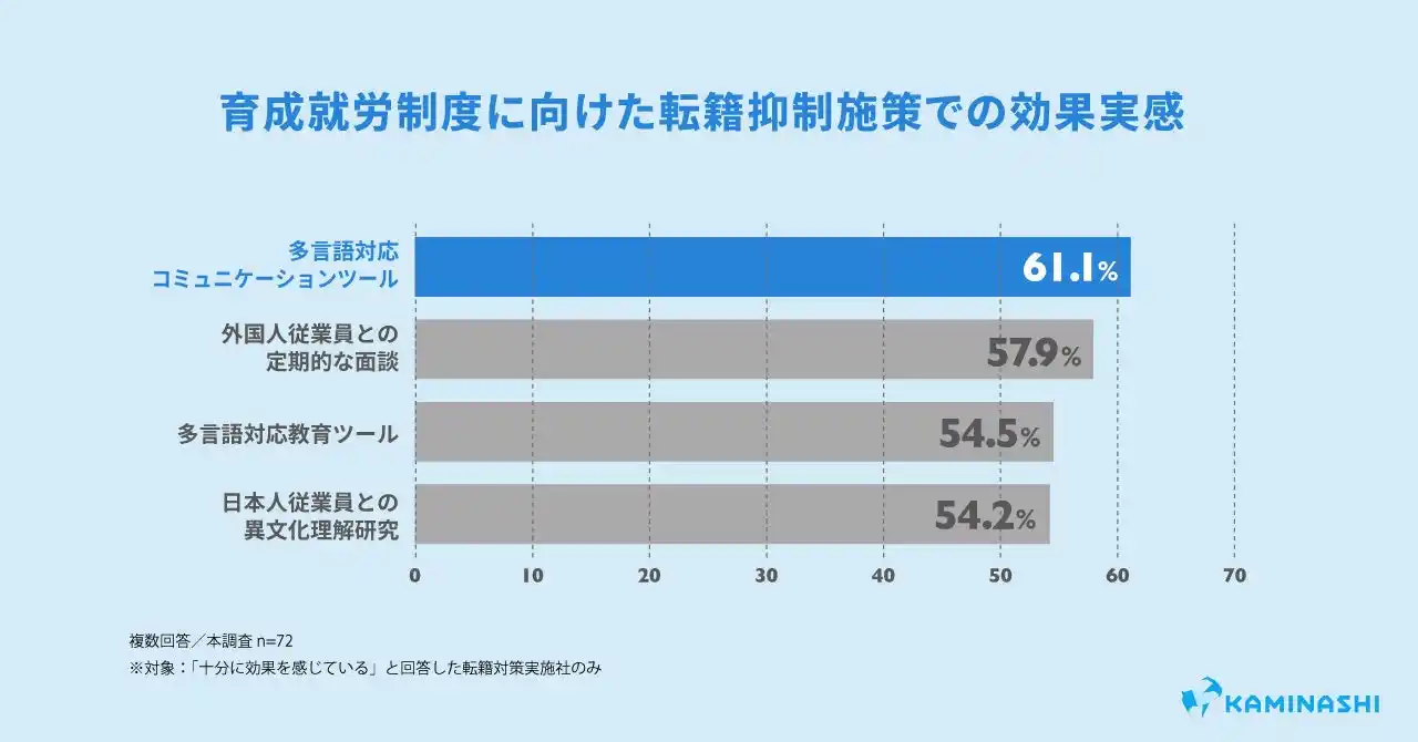 転籍抑制策として「多言語対応コミュニケーションツールを導入した」と回答した人のうち61.1%が「十分に効果を感じている」と回答。定期面談(57.9%)、多言語対応教育ツール(54.5%)、日本人従業員への研修(54.2%)を上回り、現場の多言語対応が外国人材の定着に直結することが明らかになりました。 |