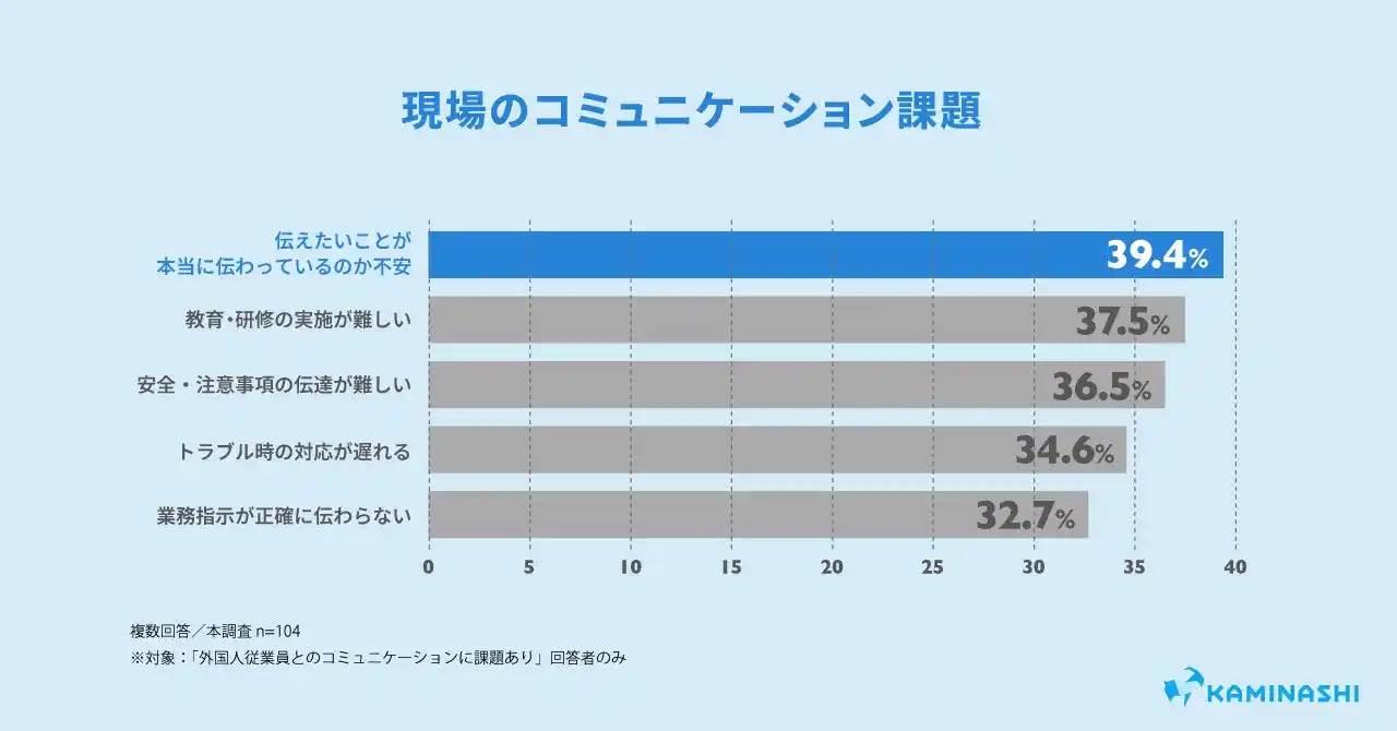 また、外国人従業員とのコミュニケーションに「課題を感じている」と回答した人は93.7%に上ります。その具体的な課題(複数回答)として最も多かったのは「伝えたいことが本当に伝わっているか不安」(39.4%)であり、「指示が伝わっていないとわかる」という顕在的な問題よりも、「伝わっているかどうかすらわからない」という"見えない不安"が現場に広がっている実態が明らかになりました。 |
