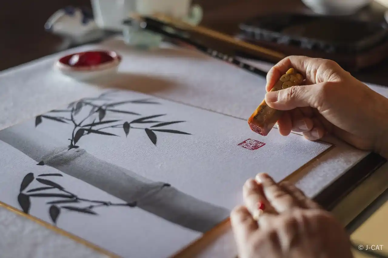 自ら墨を磨り、季節の草花を色紙に描き出すプロセスは、まさに自分自身と深く向き合う瞑想のような静かな時間。墨の濃淡が織りなす表現世界を通じて、感性を研ぎ澄ます体験をお愉しみいただけます。 |