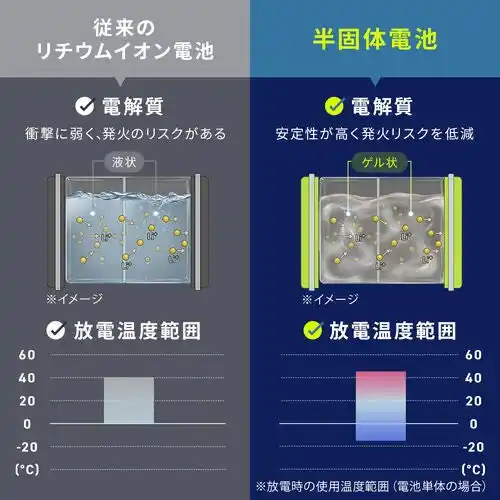 | 従来のリチウムイオン電池の課題であった発熱や膨張リスクを抑えるため、本製品では半固体電池を採用。電解質をゲル状にすることで発火リスクを低減し、より安全な充電環境を実現しています。日常的に持ち歩くモバイルバッテリーだからこそ、安全性にこだわりたい方に最適な一台です。 | |||||||||