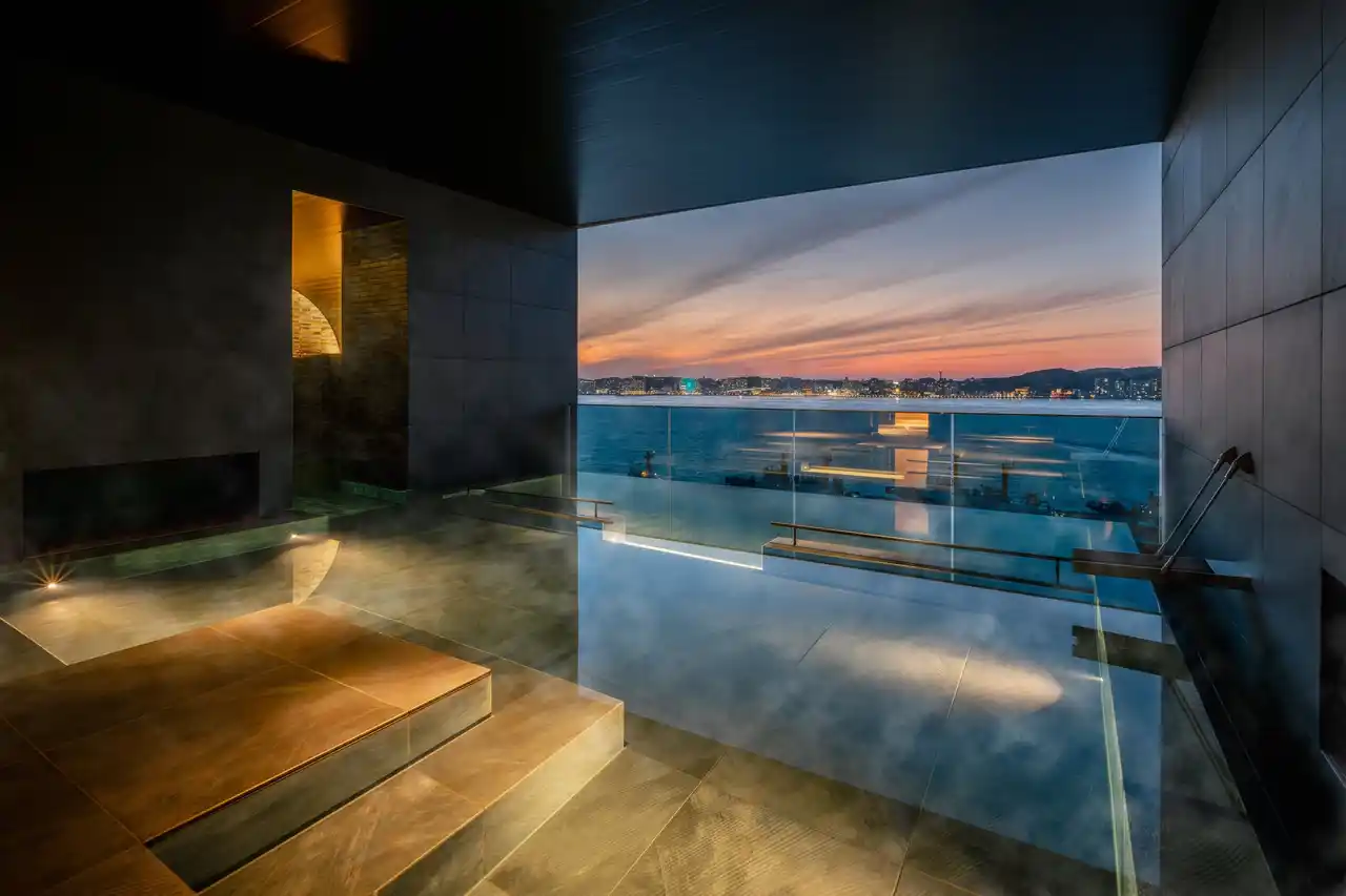 | 最上階に位置する大浴場は、関門海峡の絶景と湯船が溶け合うような、インフィニティデザインの半露天風呂です。まるで海と一体になったかのような開放的な空間で、旅の疲れを癒しながら、雄大な景色に心身をゆだねられます。特に夕暮れ時から夜間にかけては、関門海峡を行き交う船の灯りや対岸の下関に広がる美しい夜景を見晴らす特等席です。 | ||||||||||||||