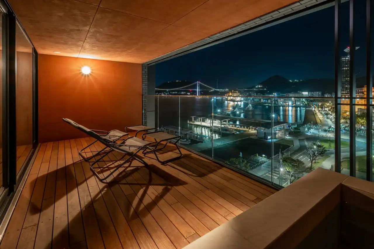 | 新たに公開する客室「テラスつき海峡サウナルーム」は、室内に本格的なドライサウナを完備した特別な客室です。セルフロウリュでは、数種類から選べるアロマで好みの香りに包まれるひとときを過ごせます。また、バルコニーには水風呂と外気浴用チェアを用意。関門橋のダイナミックな景色と心地よい潮風を感じながらのクールダウンは格別です。いつでも好きな時に、仲間内だけで気兼ねなくサウナを満喫した後は、そのままベッドへ飛び込んだり、ドリンクを片手にクールダウンしたりと、時間やルールに縛られない自由なサウナステイを提案します。 | ||||||||||||||