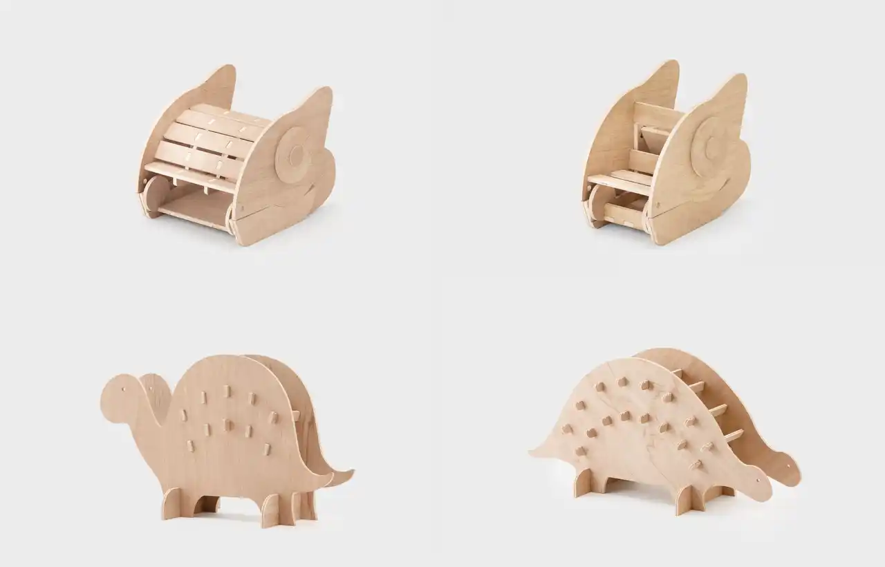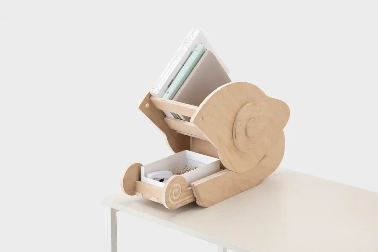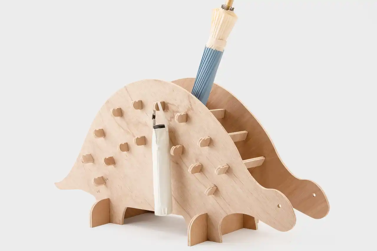 例えば、サウルスの傘立ては背中に傘を差し込めるだけでなく、側面の横棒に窪みを設けることで折り畳み傘も掛けられるよう工夫しています。また、カメレオンの家具はサイズ違いの2種類があり、それぞれ収納できるものは異なりますが、顔を兄弟のようにデザインすることで、揃えて使いたくなる関係性を持たせています。働く日常の中にちょっとした楽しさや発見を生み出すことを目指し、ユーモアのある家具へと展開しています。 |