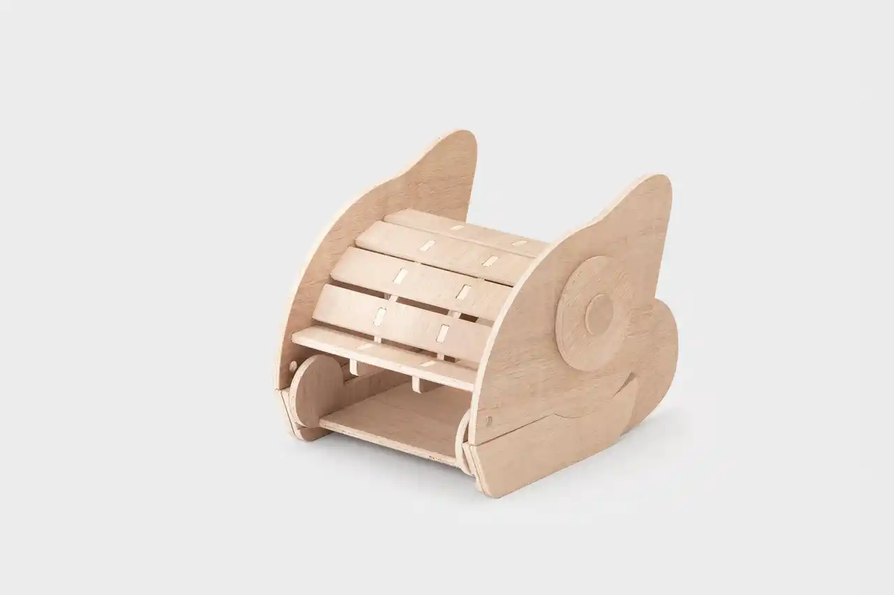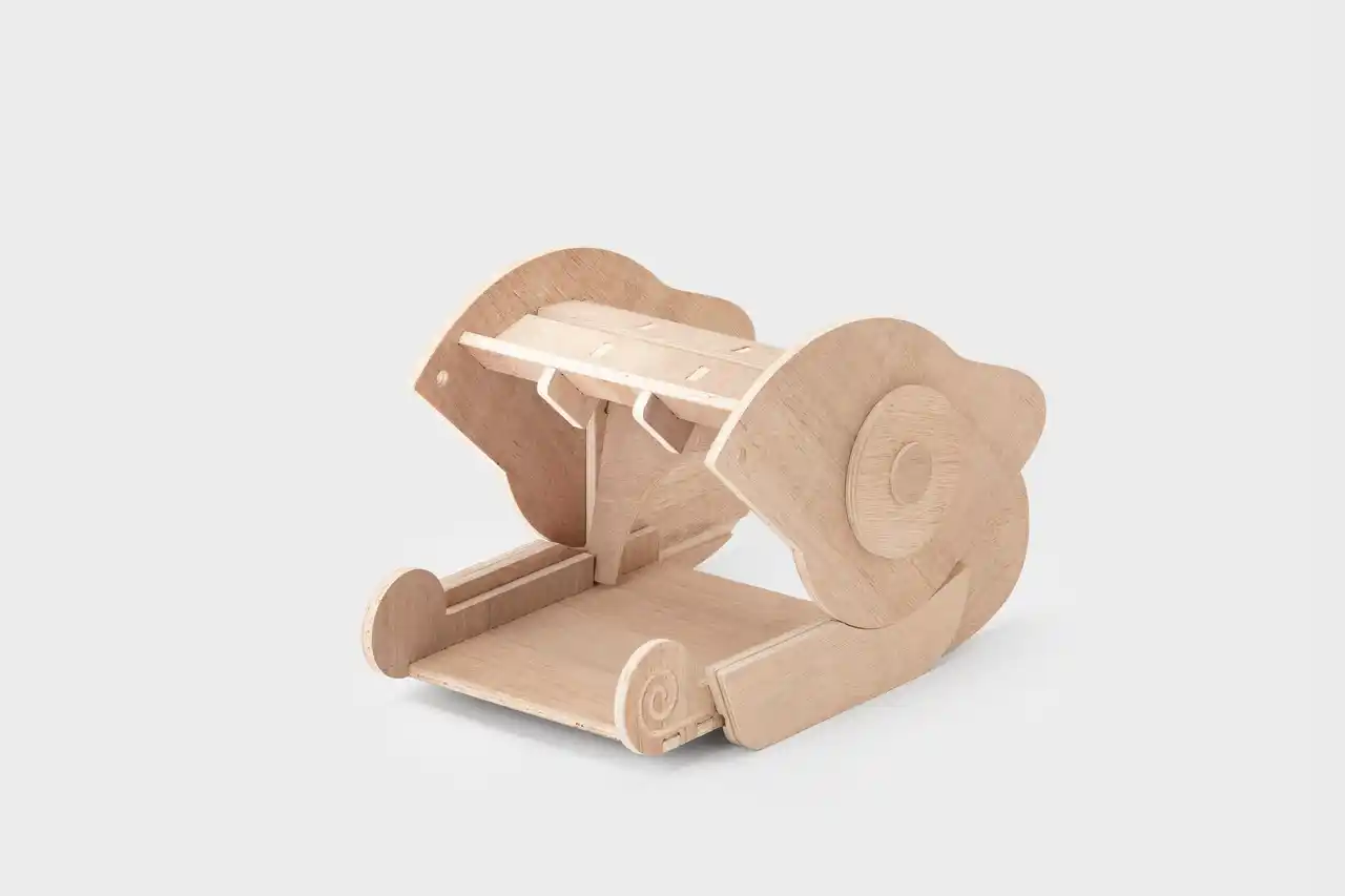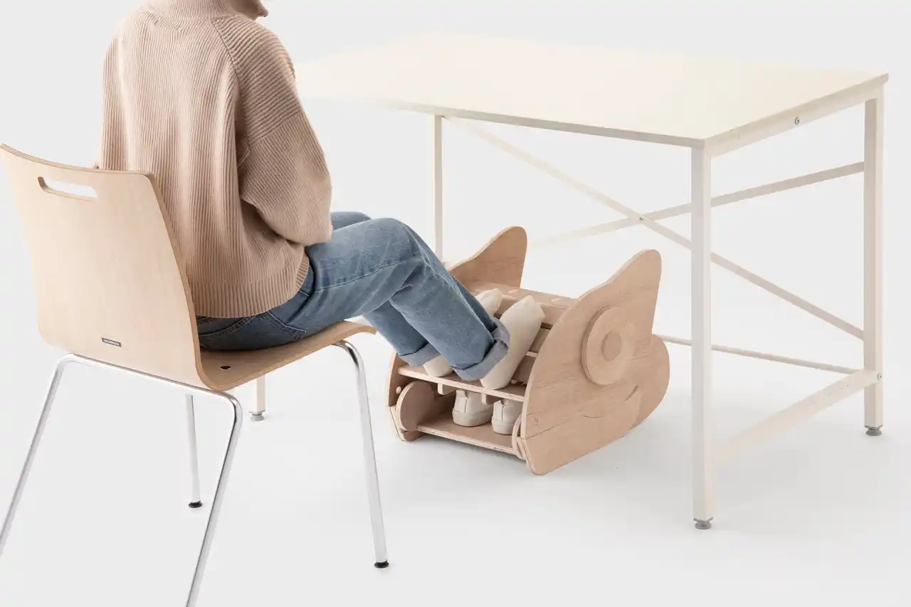 デスク下に潜むカメレスト。カメレオンをモチーフにした足置きは、疲れやすいデスクワークに安らぎをもたらします。舌の上に置いた靴は口の中に収納され、靴を脱いで足を置くまでの一連の動作は足先だけで完結。机の下にもぐって手を使う必要はなく、自然に行えます。オリジナルの配色で自由に彩ることで、自分色にカモフラージュするマイカメレストを作れます。みんなのことを支えるカメレオン達があなたの近くにも潜んでいるかも? |