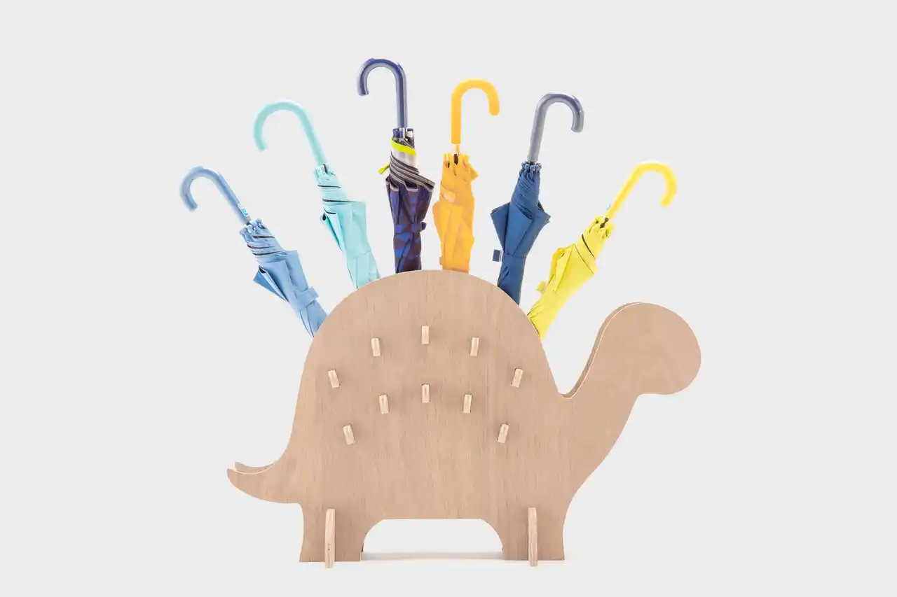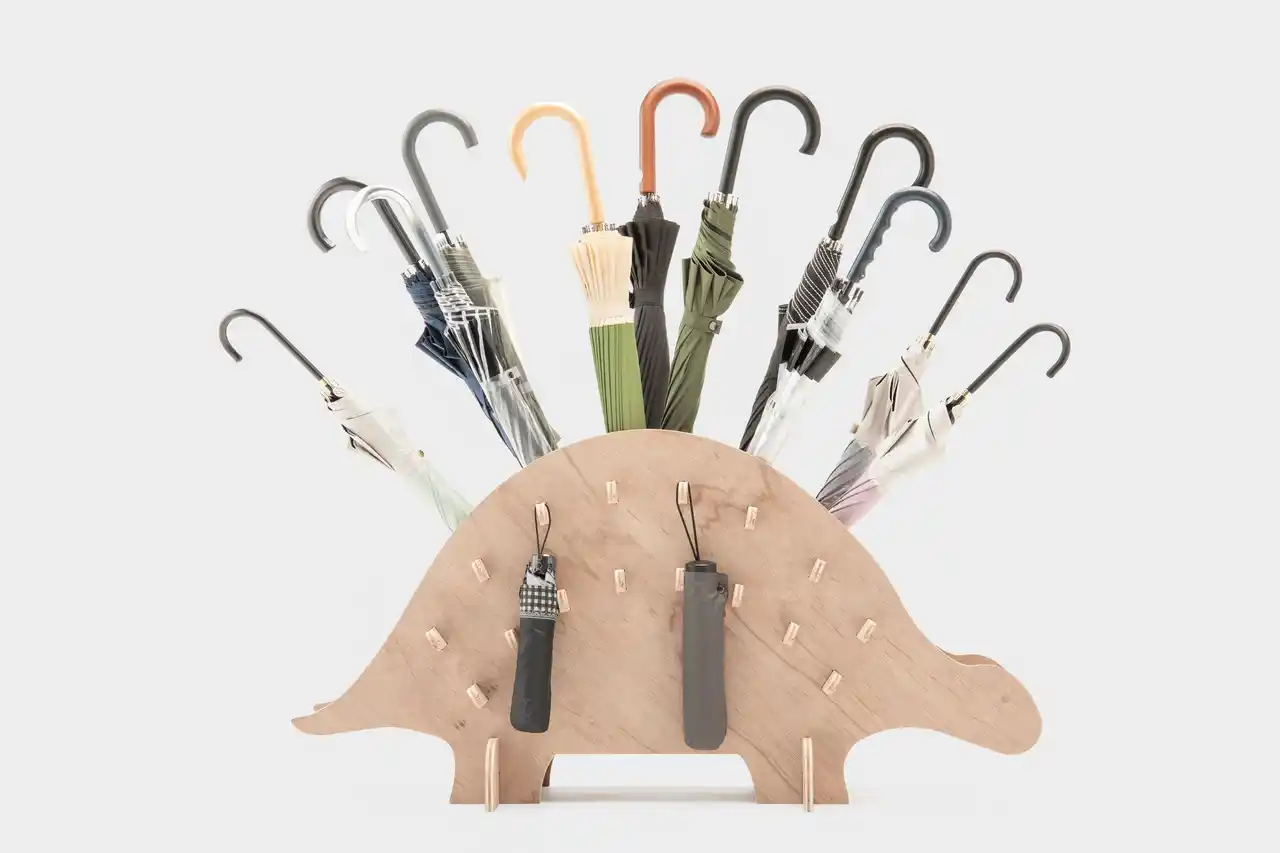 雨の日、ひょっこり現れるのは…カサを背負った恐竜です。入口のすみっこで、今日も静かにあなたの傘をお預かりします。ちょっと憂うつな雨の日も、サウルスたちがいれば少しハッピーになるかもしれません。背中には約30本の傘をしっかり収納します。置く場所の雰囲気に合わせて防水マットや人工芝を敷けば、床も濡れずに安心です。折りたたみ傘も引っ掛けやすい、工夫された差し込み棒が付いています。しかも、組み立ては簡単3ステップ!子どもでも迷わず完成できちゃう、やさしい設計です。 |