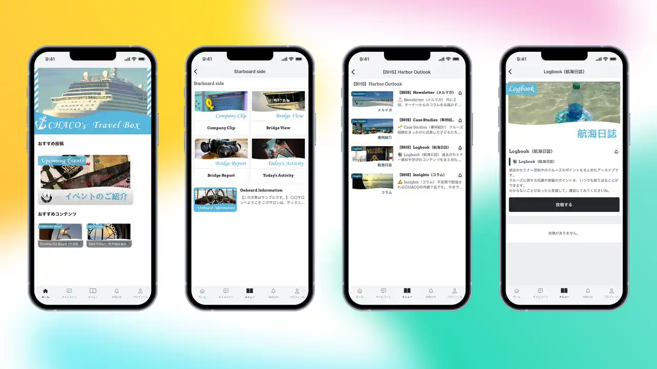 「CHACO's Travel Box」は、ディズニークルーズへの参加を検討している子連れファミリー・ディズニークルーズ好きのママを対象に、実体験に基づいたリアルな情報と、同じ目標を持つ仲間とのつながりを提供するオンラインコミュニティです。FANTSのライブ配信・コミュニティ機能を活用し、旅の計画から出発準備まで継続的にサポートします。 |