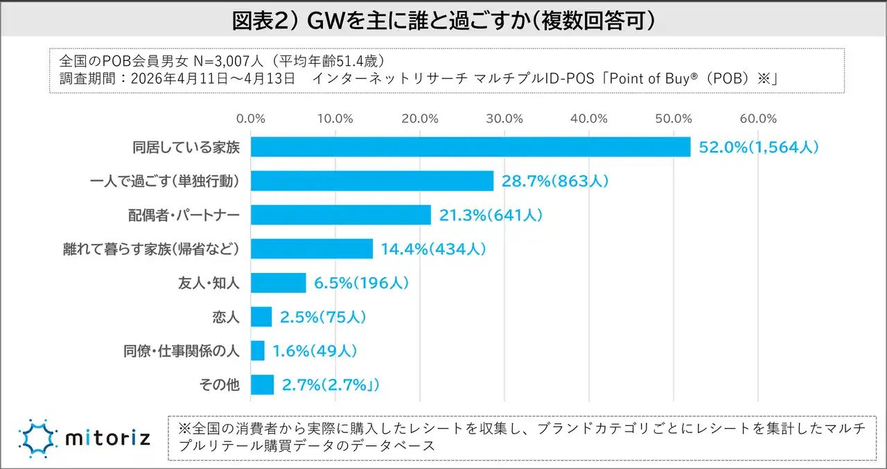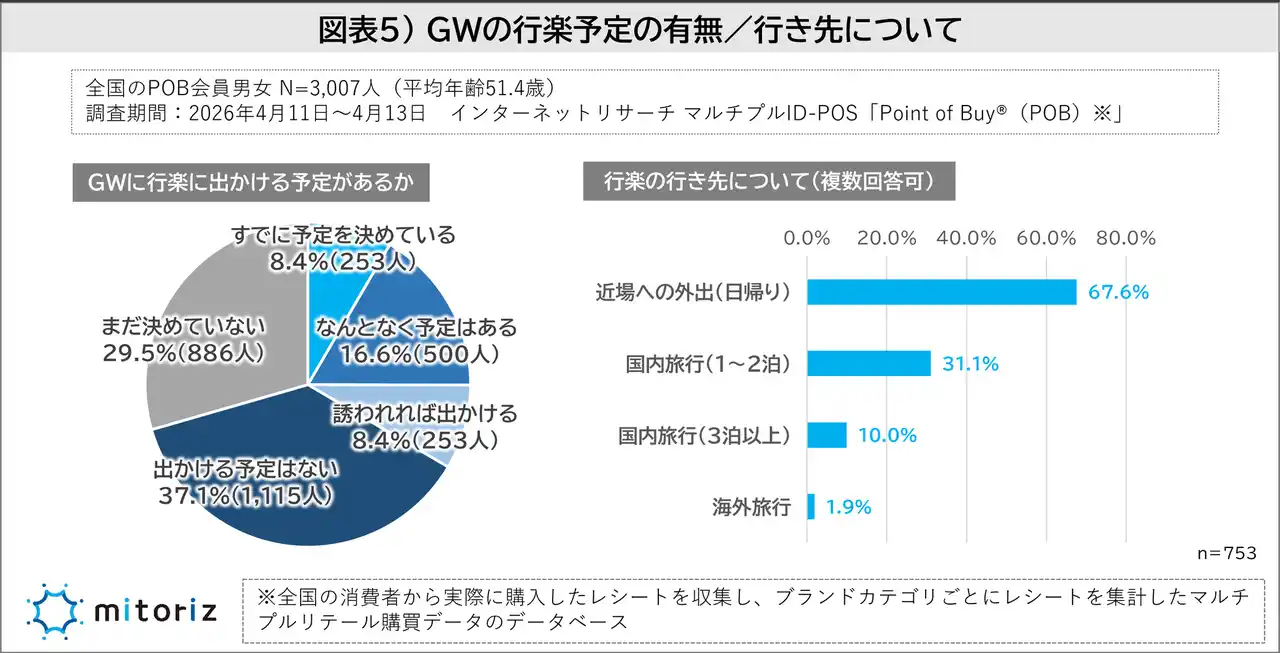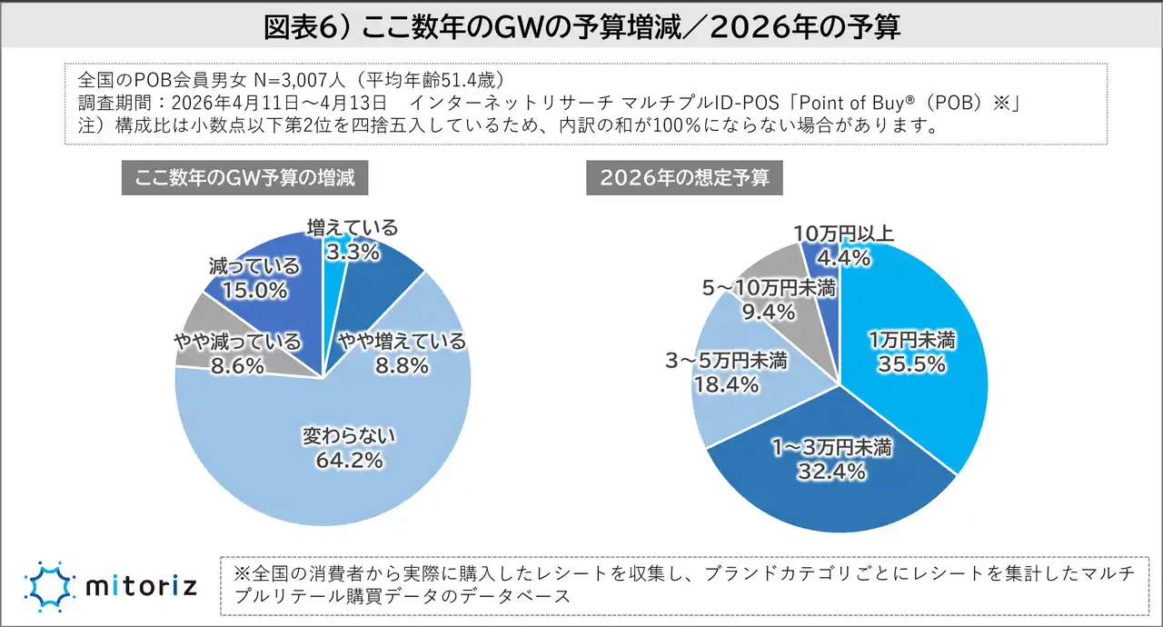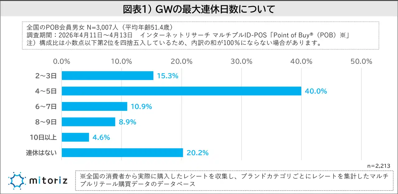株式会社mitoriz(本社:東京都港区、代表取締役社長:原田光幸)は、消費者購買行動データサービス「Point of Buy(R)(以下、POB)」の会員3,007人を対象に「大型連休に関する調査2026」を実施しました。 |