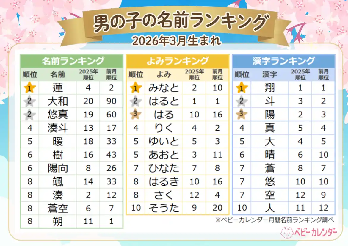 2026年3月生まれ 男の子に人気の名前ランキング|ベビーカレンダー月間名前ランキング調べ |