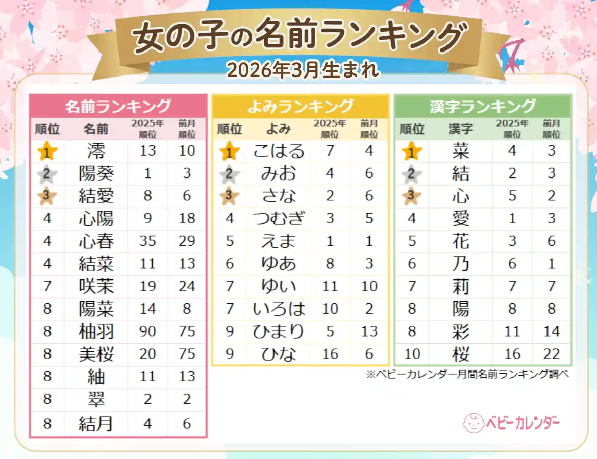 2026年3月生まれの女の子の名前ランキングでは、1位「澪(みお)」、2位「陽葵(ひまり)」、3位「結愛(ゆあ)」、同率4位「心陽(こはる)」・「心春(こはる)」・「結菜(ゆいな)」という結果になりました。春のやわらかな日差しやぬくもりを感じさせる名前が多く、3月らしい明るくあたたかな雰囲気がうかがえます。 |