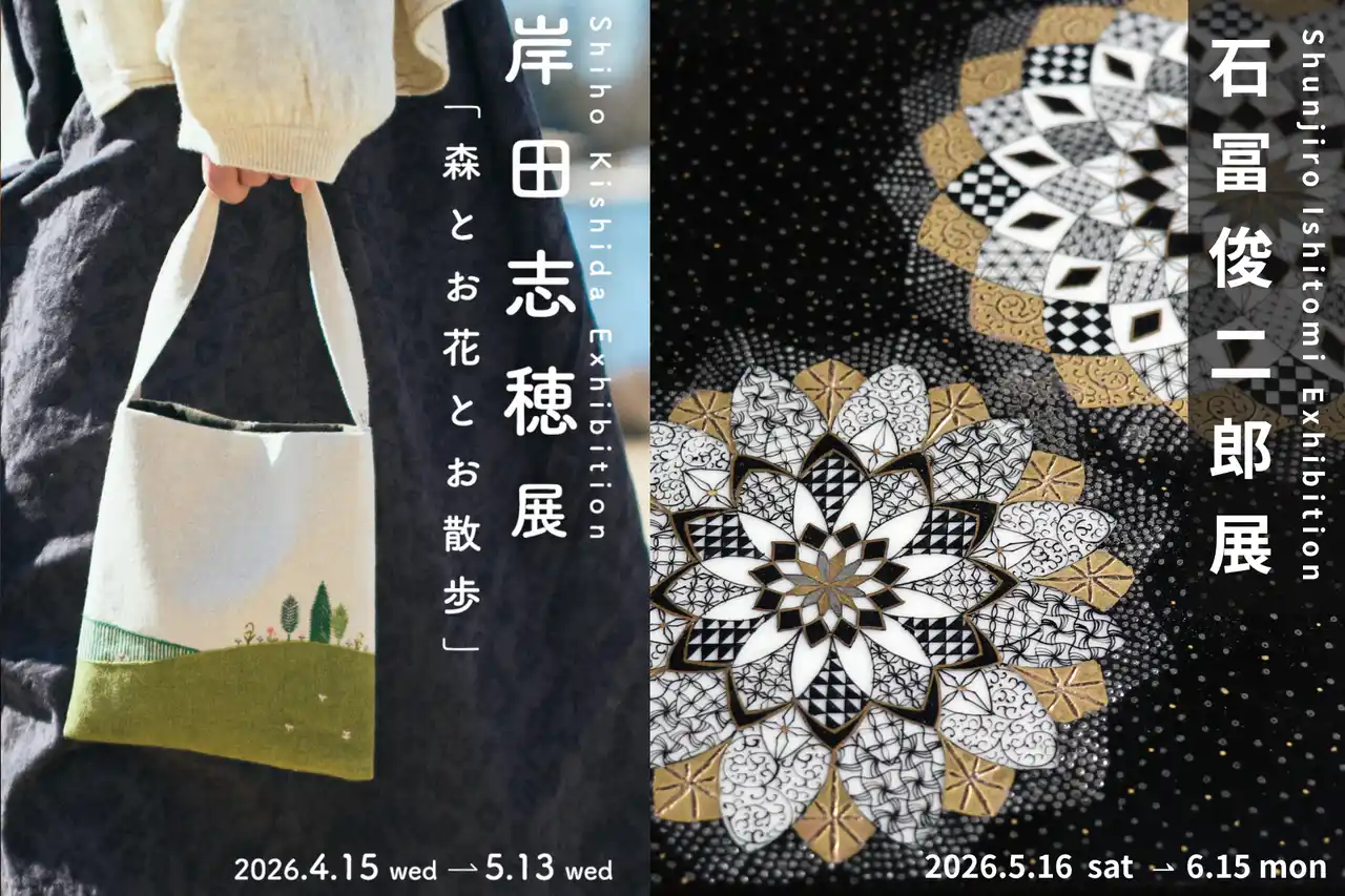 | 石川県金沢市を拠点に活動する染色・刺繍作家、岸田 志穂氏の個展を開催いたします。本展では、捺染、手刺繍で制作したアクセサリー・バッグなどの布小物や額など、約100点の出展を予定しております。この機会にぜひご高覧賜りますようご案内申し上げます。 | |||||||||||||||||||||