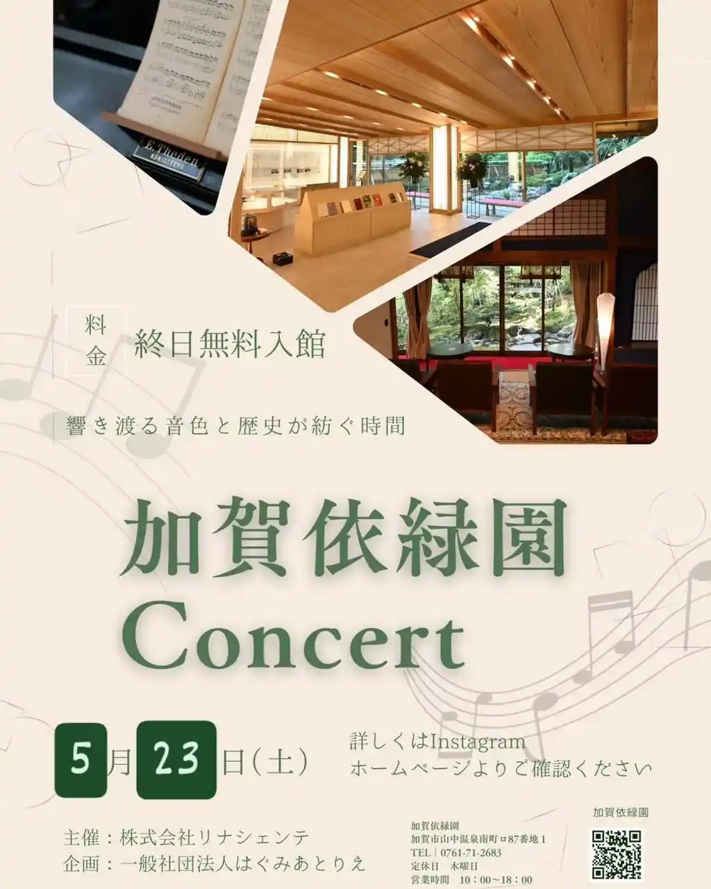 | 新緑が美しく映える5月の加賀依緑園では、歴史ある空間で音色を楽しむ「加賀依緑園 Concert」をはじめ、和装でお得にご来館いただける「KIMONO週間」、スタッフの案内と抹茶体験が楽しめる「加賀依緑園を巡る旅」など、初夏の園内を満喫していただける企画を開催します。庭園や建築、文化にふれながら、加賀依緑園ならではのひとときをお過ごしください。 | |||||||||||||||||||||