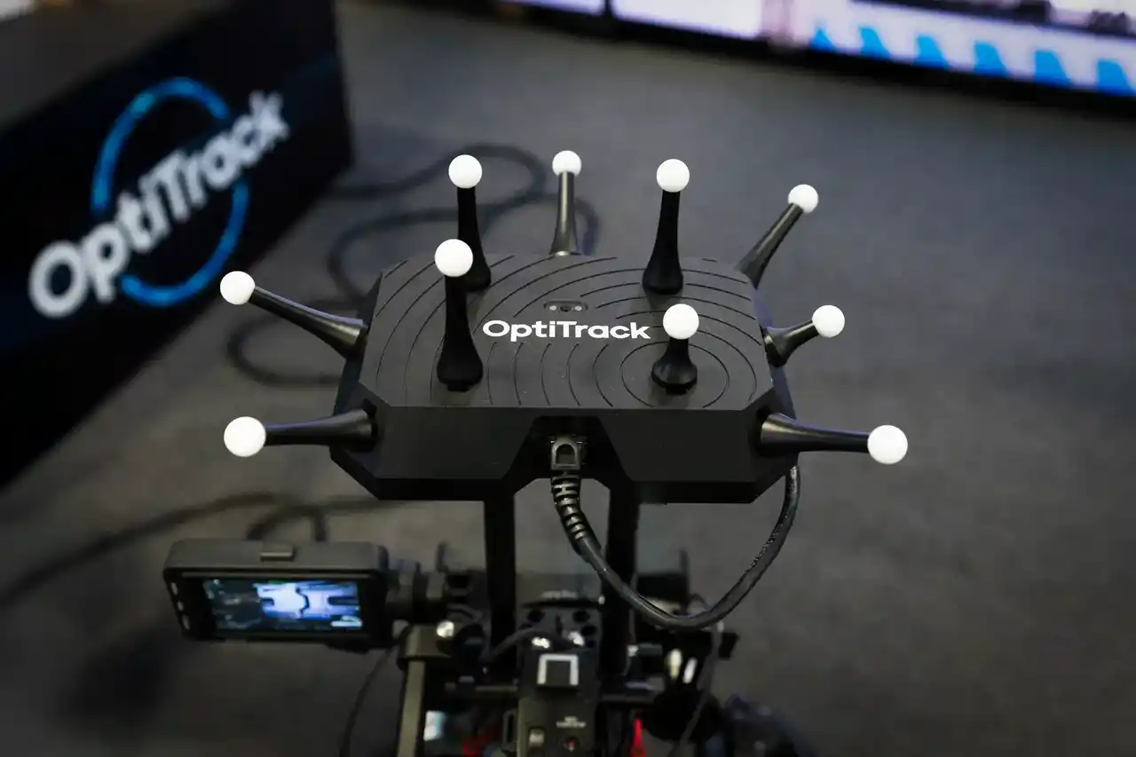 カメラのトラッキングは、光学式のモーションキャプチャシステムOptiTrack(オプティトラック)を使用。カメラの上に取り付けられたOptiTrack Wired CinePuckの位置トラッキング(光学式+IMU融合)とレンズメタデータをRigFXハブでリアルタイムに統合します。システムはOpenTrackIOを介して統合されたデータを出力し、レンダリングエンジンで直接使用しています。これにより、安定したトラッキング、低遅延、そして一貫性のある結果が保証されます。 |