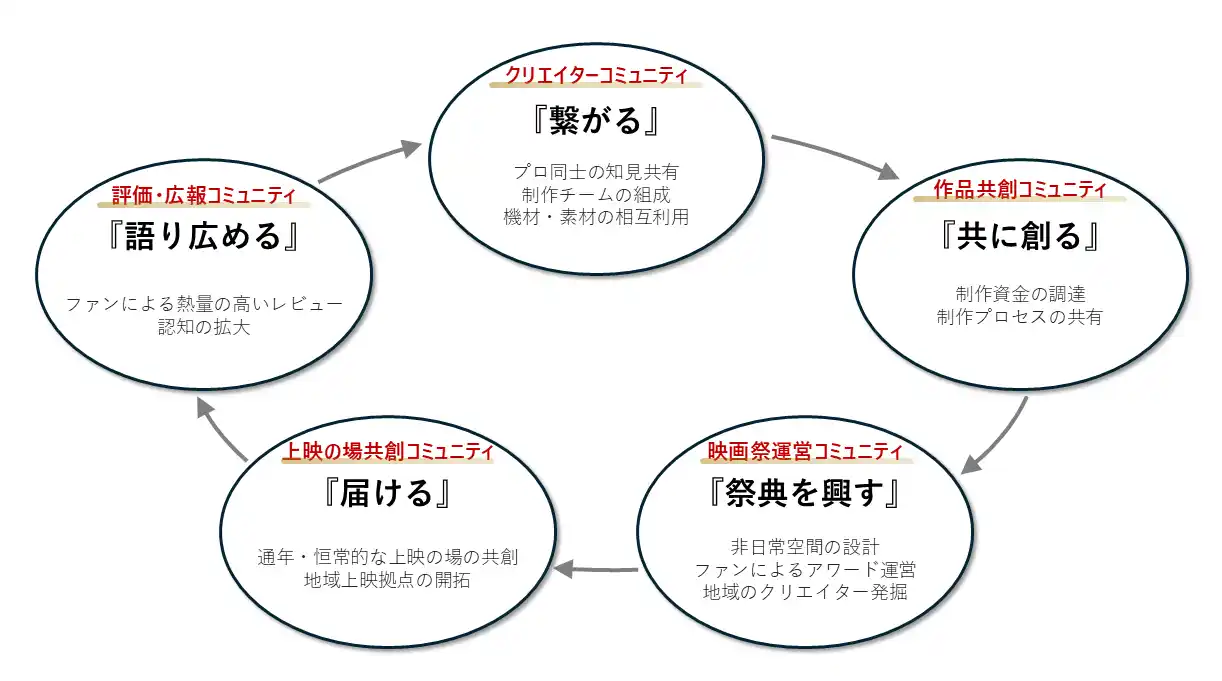 民主的なコミュニティの組成と相互連携によるクリエイターエコノミーの活性化 自発的なコンテンツ制作のチーム作り、制作資金のクラウドファンディング、作品制作プロセスや映画祭運営へのファンの参画、上映の場や作品の評価・プロモーションへのファンや支援者との共創など、様々なコミュニティを構築して相互に連携させることで、作品が生まれて公開され世の中に広がっていくまでの一連の流れを加速させることを目指します。 |