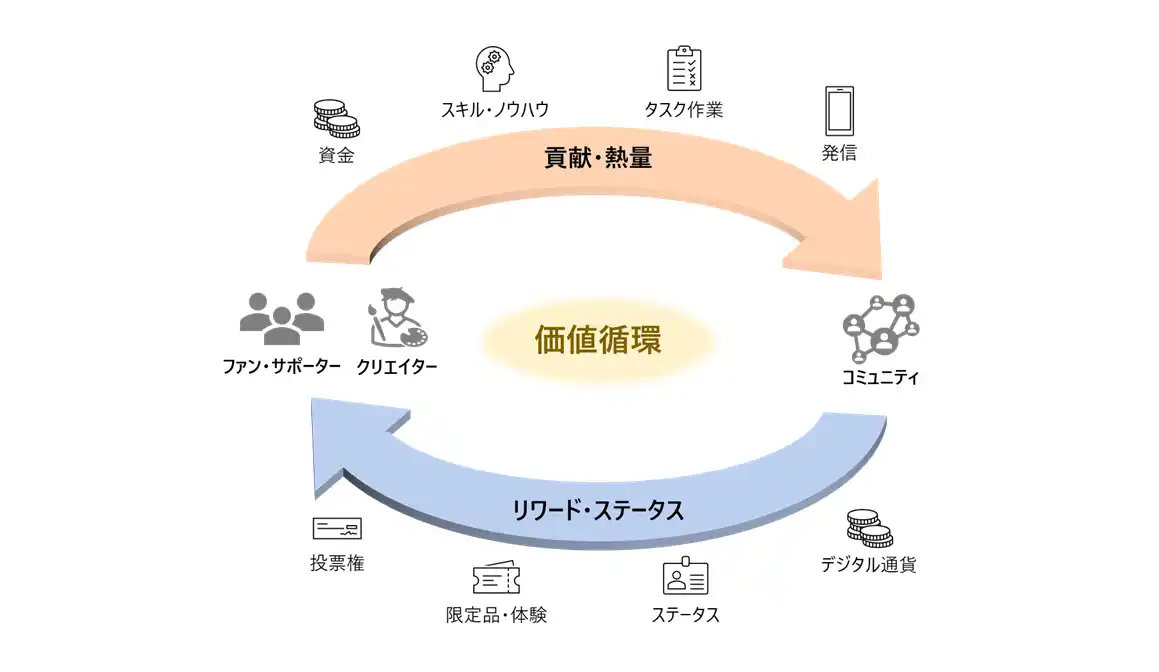 クリエイター間の連携の場を作ることで創作活動を活性化させ、従来の「コンテンツを制作する側/消費する側」という枠組みを超えたクリエイターとファンの共創関係を構築するなど、新たなコミュニティモデルへと進化させていくことがねらいです。DCJPYの導入により、資金調達・活用の透明化、クリエイターへの適切なロイヤリティ還元、適切なリワード設計によるコミュニティ駆動モデルを実現します。 |
