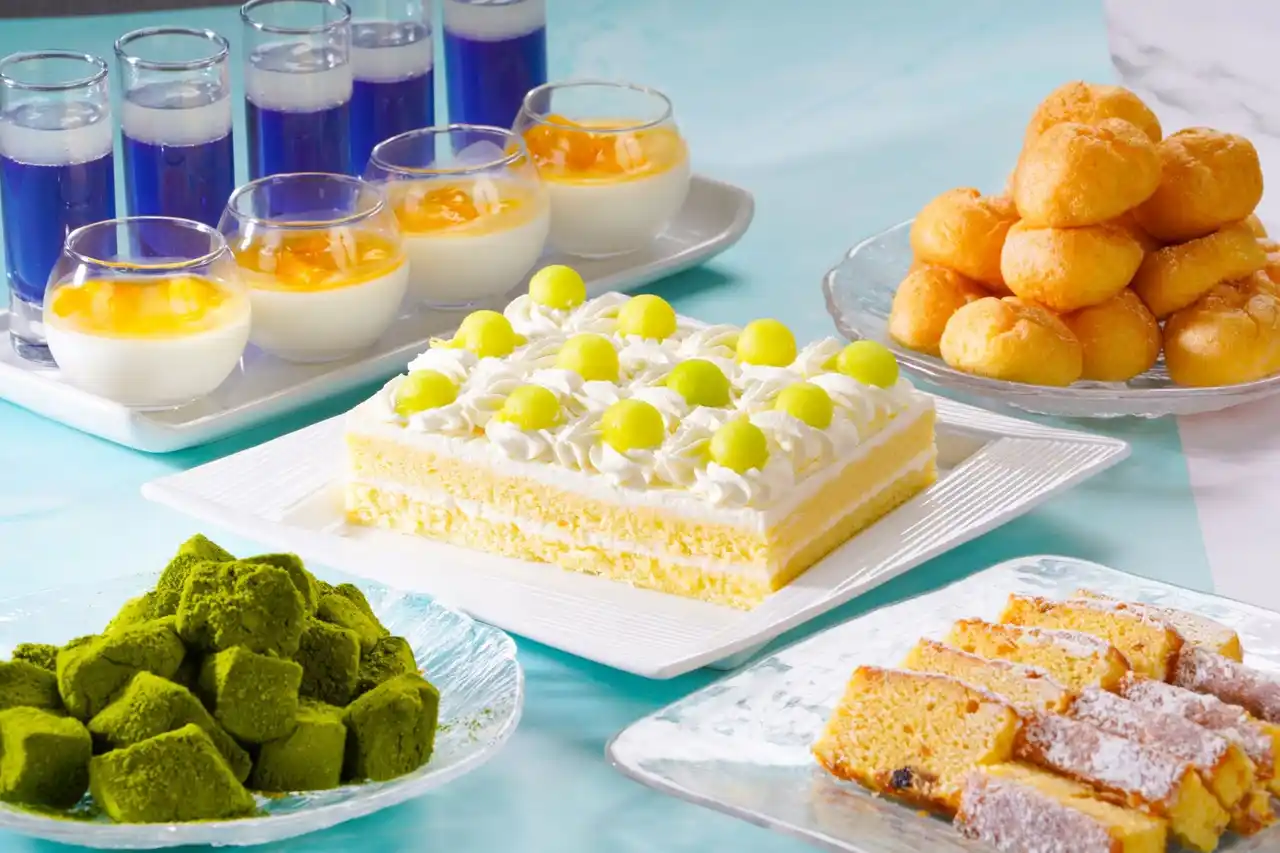 ・メロンのショートケーキ ・マンゴーのブランマンジェ ・シュークリーム ・バタフライピーティーとレモンのゼリー 他 |