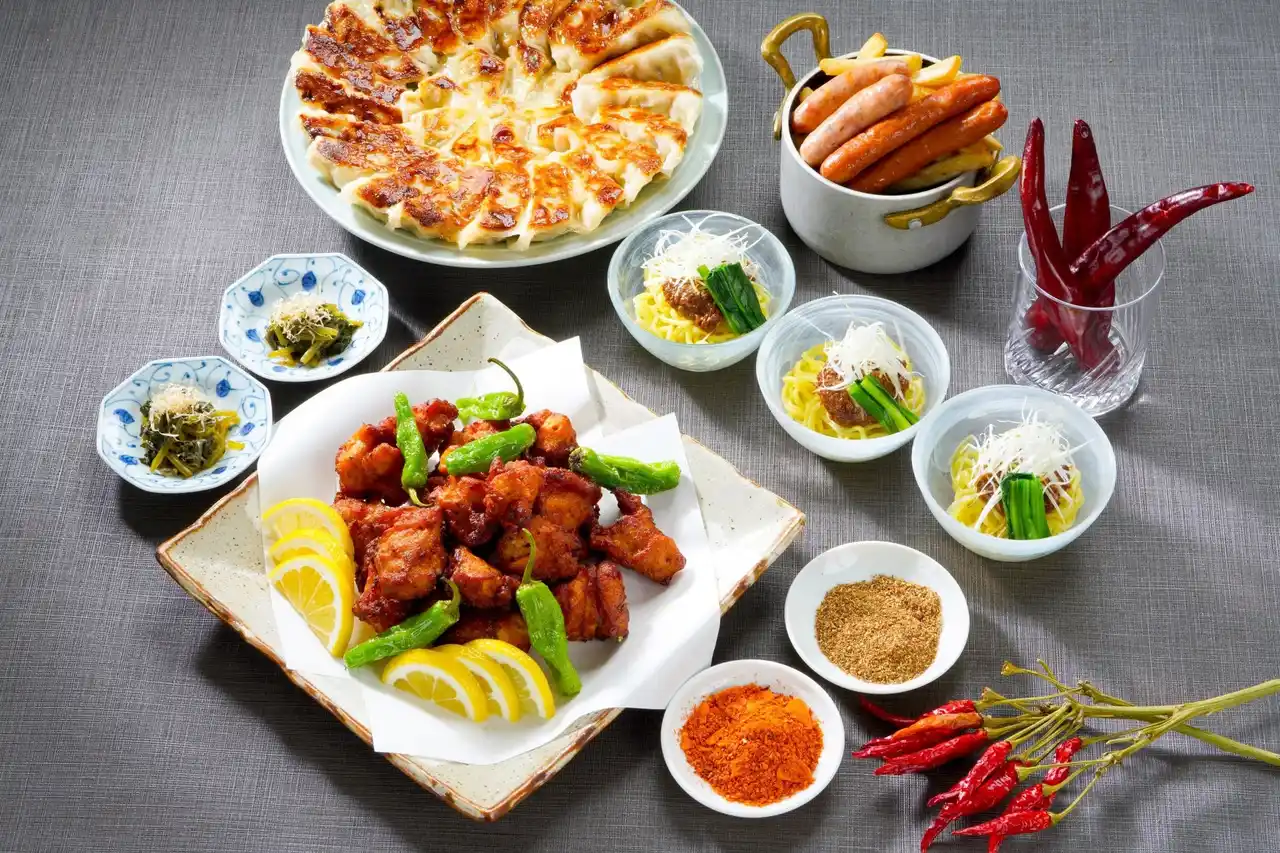 ・サーロインステーキ ・ペパロニピザ ・トンポーロー ・ウィンナー2種 ・ピリ辛餃子&焼き餃子 2種盛り ・お好み焼き ・チキン南蛮 ・温製玉子とパルメザンの赤ワインソース ・バターチキンカレー ・冷製担々麺 |