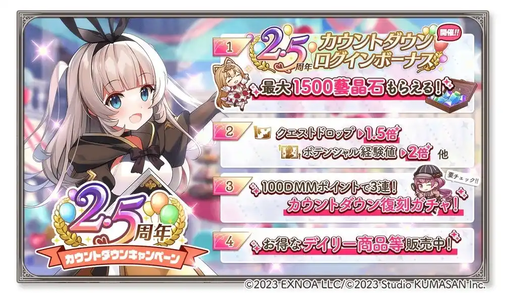 もうすぐ迎える2.5周年に向けて、豪華なログインボーナスや各種キャンペーン、特別なガチャやパック販売を実施いたします。 |