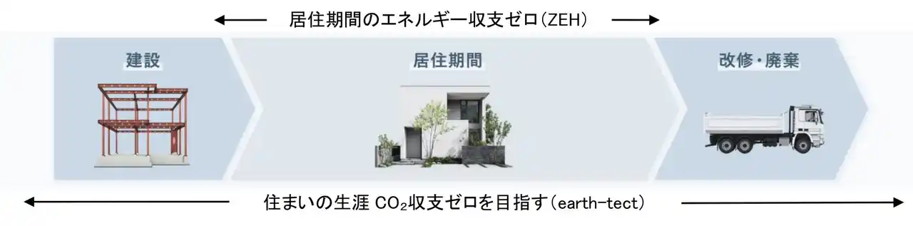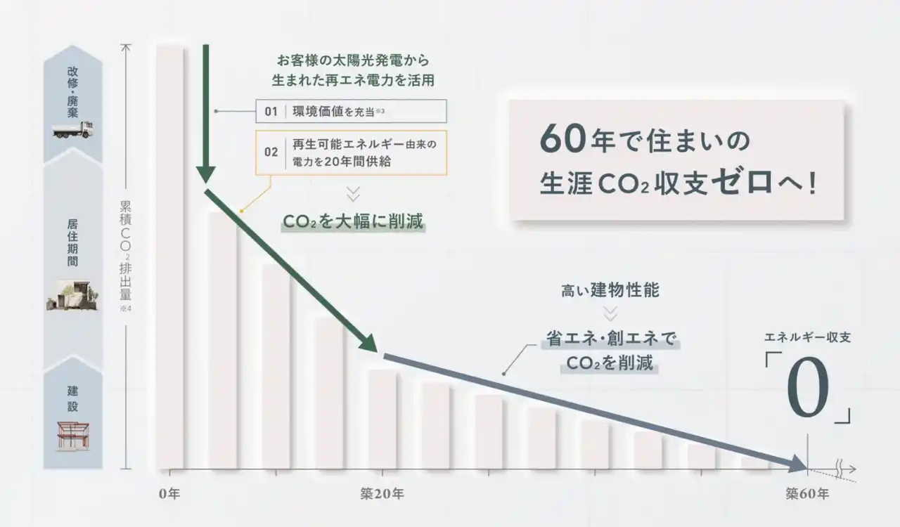※3.関連リリース:https://www.asahi-kasei.co.jp/j-koho/press/20250905-05/index/ ※4.達成には当社規定の仕様の採用と、ヘーベル電気(earth-tect用)への20年間の加入が必要です。また、プランや仕様によっては達成の時期が前後する場合があります。LCCO2排出の考え方は、環境性能評価ツールであるCASBEE-戸建(新築)2018年版に準拠。一次エネルギー消費量はエネルギー消費性能プログラム(住宅版)により算定、ならびに、“LCCM低層共同住宅部門の基本要件(LCCO2)適合判定ツール2024年版 ver.2.0”を参照 |
