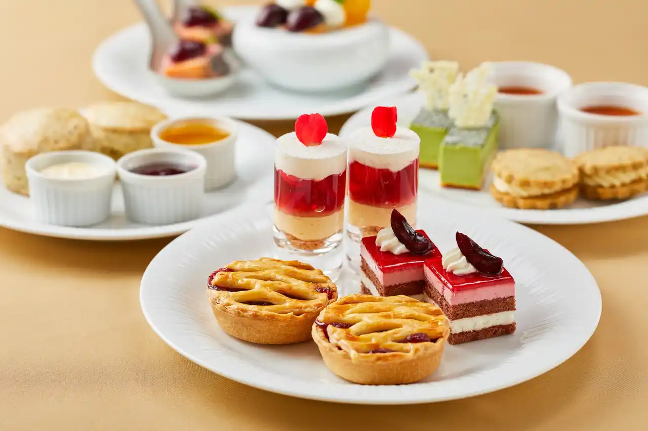 スイーツは、素材の個性を活かした構成で、チェリーの酸味と紅茶の香りが調和するラインナップです。サワーチェリー、スウィートチェリーそれぞれの特徴に合わせ、味わいと香りのバランスにこだわりました。 |