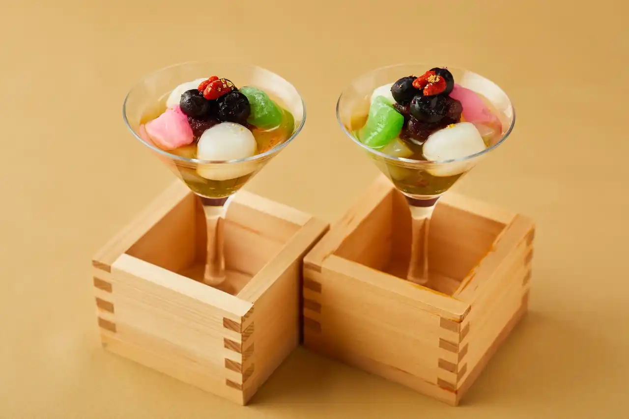 青梅、紅茶蜜、陳皮、枸杞の実、求肥、ブルーベリーなどを使用し、目の疲れや季節の不調に寄り添う内容で見た目の美しさとともに、身体の内側から整える一品として仕上げています。繊細な日本料理にならい、具材は一口サイズに。器の中での素材の重なりが、和の品格を感じさせます。 |