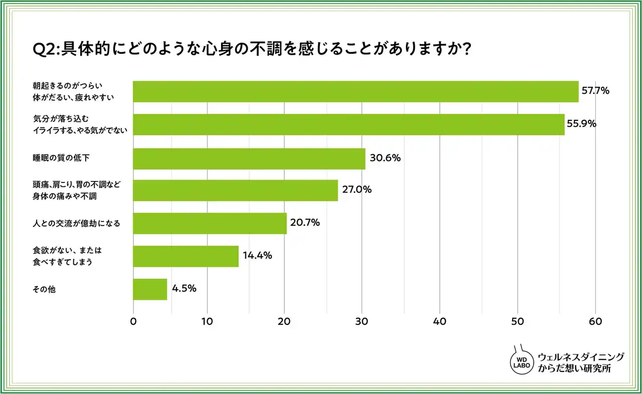 【ポイント】 最も多かった不調は、「朝起きるのがつらい、体がだるい、疲れやすい」(57.7%)となり、次いで「気分が落ち込む、イライラする、やる気が出ない」(55.9%)であった。身体的な疲労感に加え、精神的な落ち込みも顕著であり、心身ともに不調を感じる人が多いことがわかる。 |