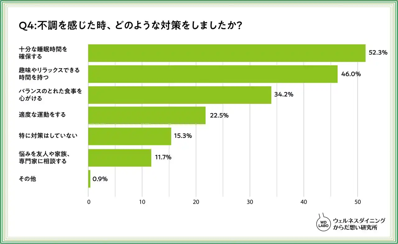 不調を感じた際の対策は「十分な睡眠時間を確保する」が52.3%で最も多く行われており、次いで「趣味やリラックスできる時間を持つ」(46.0%)、「バランスの取れた食事を心がける」(34.2%)が続く結果となった。規則正しい生活習慣やリラックスすることを心がける人が多い傾向がみられた。