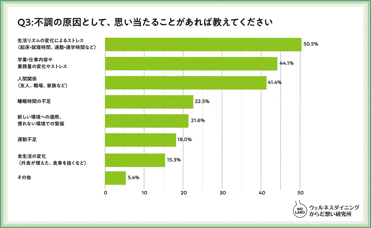 不調の原因は、「生活リズムの変化によるストレス」(50.5%)が最も多く、次いで「学業、仕事内容や業務量の変化やストレス」(44.1%)、「人間関係」(41.4%)が続いた。4月~5月にかけて起こりやすい環境の変化が心身にストレスを与え、結果として不調につながっていることが考えられる。