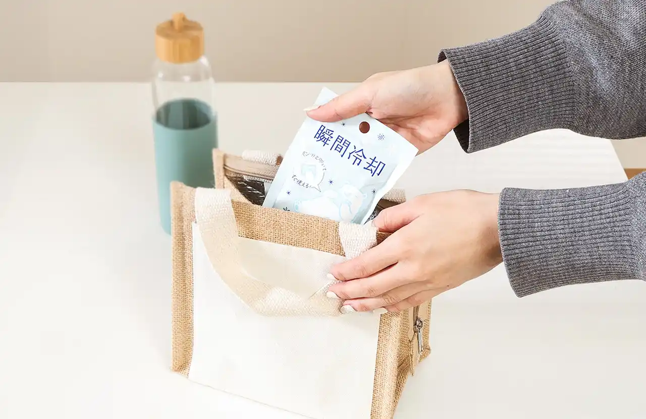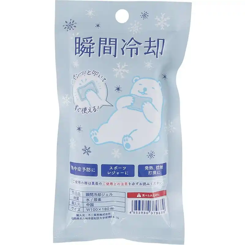 中の水袋を叩いて割ることで化学反応が起こり、すぐに冷却できる瞬間冷却ジェル。冷凍の必要がなく、外出先でもすぐに使用できます。冷たさは28℃の環境で約20~30分持続します。使用後は冷凍することで保冷剤として再利用可能です。シロクマのイラストをあしらったデザインで、見た目にも涼しさを感じられます。 |